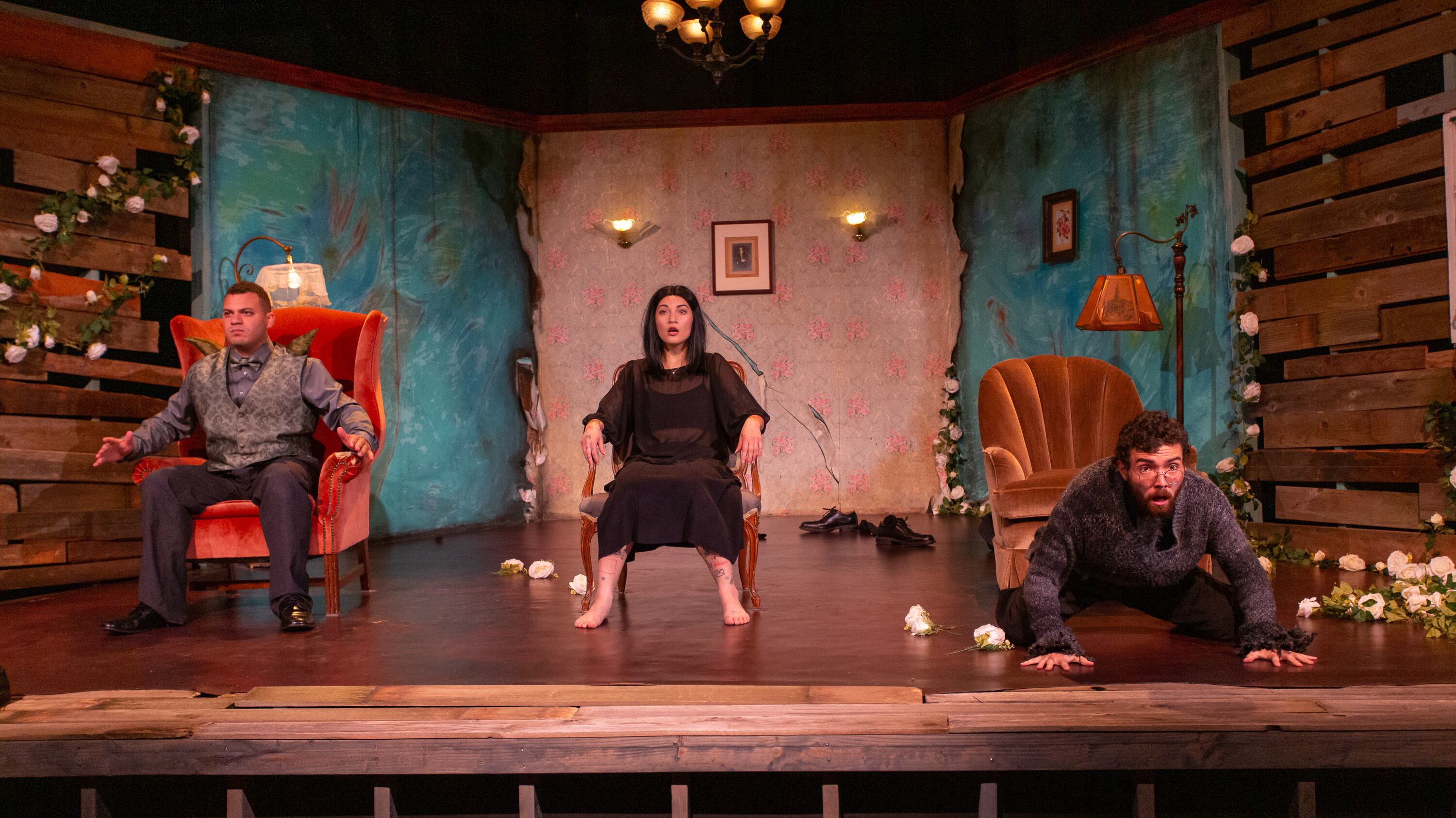 Shaking the Tree Theatre’s surreal and terrifying production of Celine Song’s Family starts with three siblings staring silently into space. They are seated in a living room lovingly adorned with pale flowers, but by the story’s end, blossoms will be strewn across the stage and the quiet will be shattered by a man screaming, “Burn it down!”