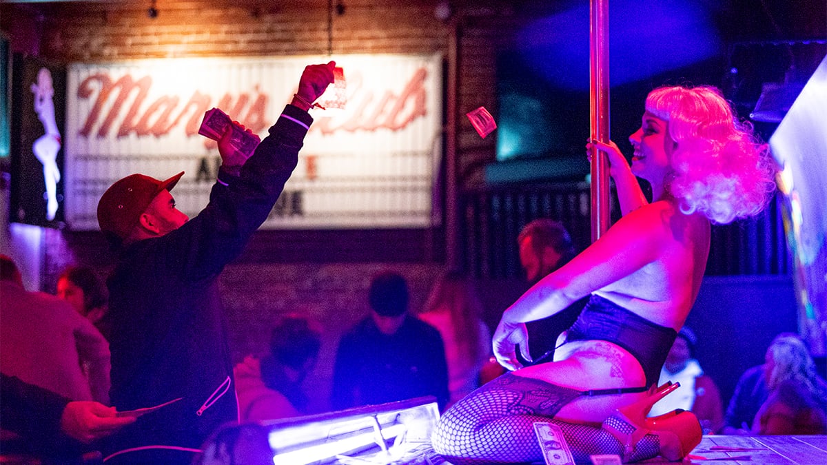 A dancer named Artemis was twirling her black panties around one hand when a 50-something man in a skullcap sat at the edge of her stage. Immediately, the patrons around him began placing dollars in front of him, singles folded lengthwise and stacked neatly in layered pairs like a little log cabin.