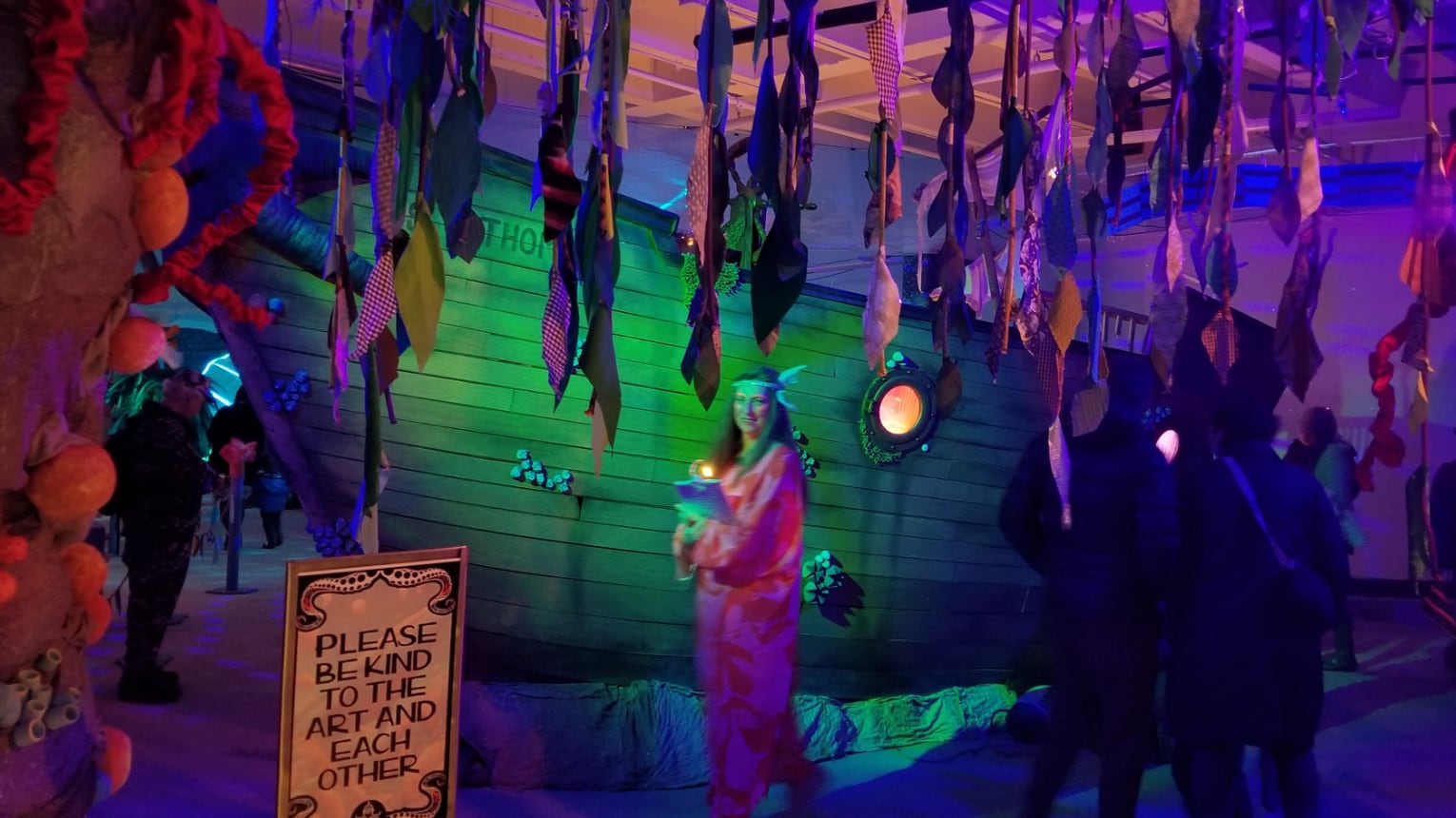 Guests enter Fathom through its orange fur-trimmed hall of mirrors, entering a cove filled with fluorescent tidal pool creatures that lead to impressive installations. Some of Fathom’s best features include an infinity mirror room; a giant anglerfish cove with a disco ball lure; a white cloth whale animatron; an iridescent clam bed begging for an Instagram pinup spread; and an electric plasma vortex gate that looks ready to tear open an interdimensional hole. Herring says Fathom has a loose multiverse storyline which encourages guests to not stick to any one path when visiting.