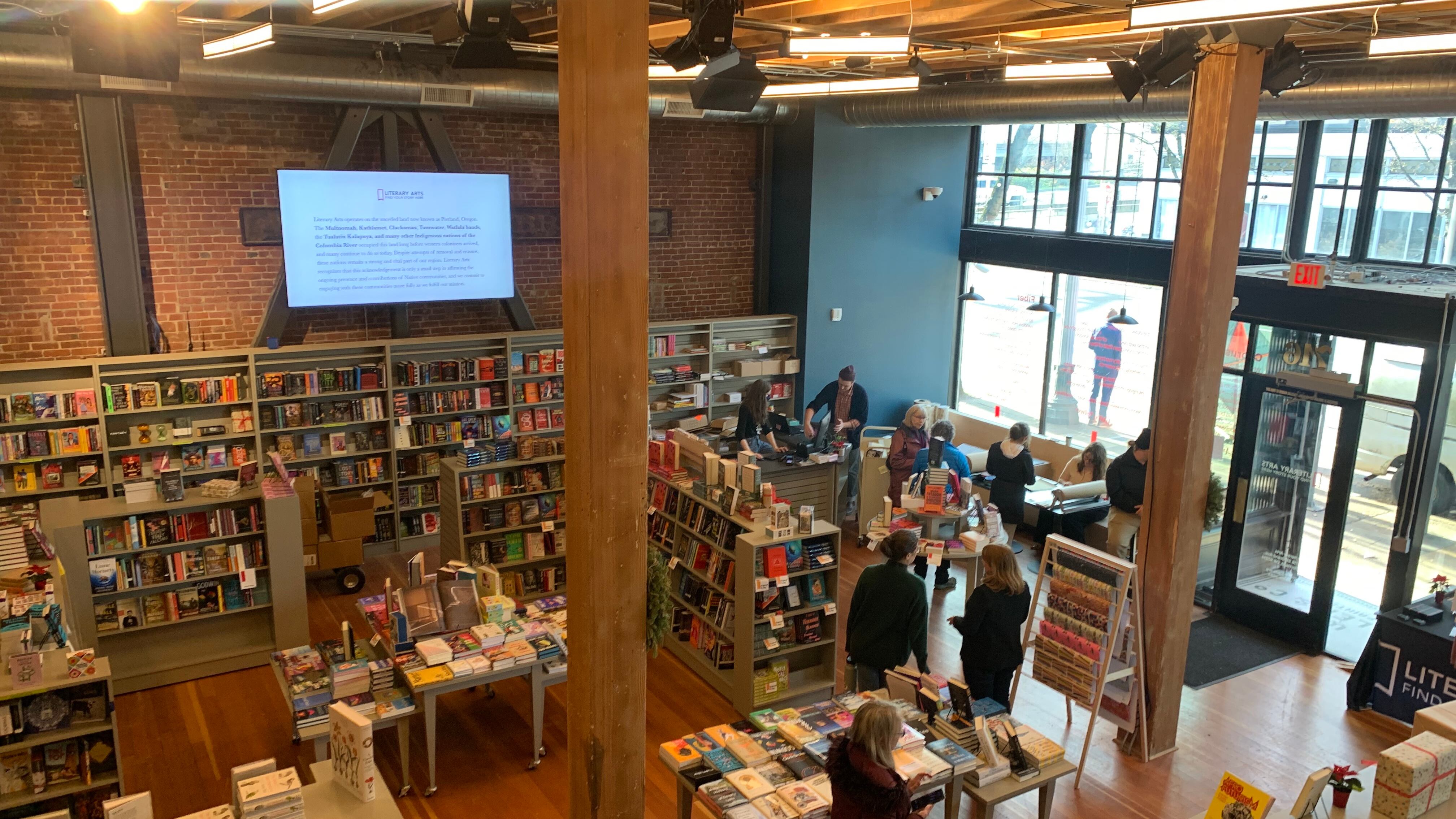 During its soft opening Dec. 6, small clusters of passersby and those in the know walked into the new space, rare sun pouring through the storefront’s west-facing windows. Literary Arts staff chatted with customers who perused books, picking up free black totes by the door. The space’s new first-and-second-floor bookstore was up and running, though sections were still marked by Sharpie on tape. Half the shelves were on rollers, but those will remain, as they’re meant to swing out of the way to transform the ground floor into a 75-seat auditorium, if needed.
