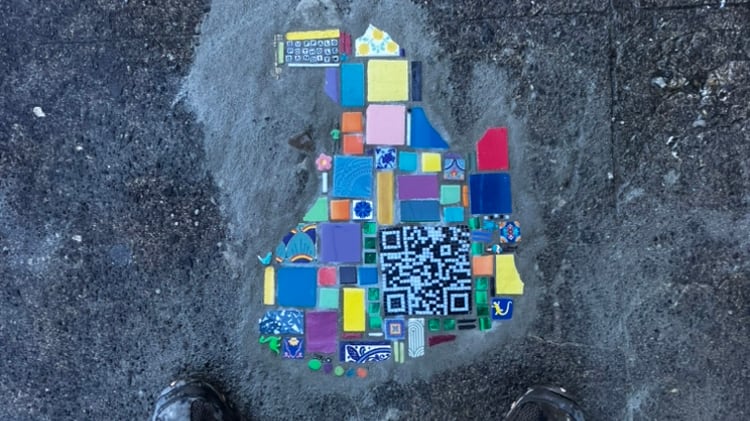 But the Bandit—who would not provide any information about their identity, other than that they live in Buffalo, N.Y., and has no formal art background—isn’t just pouring some quick-dry asphalt mix into the potholes: they make elaborate and whimsical mosaics in the cement. In Portland, they made an airport carpet-themed design, as well as a tiny milk-and-cookies pothole fix and a ladybug wearing a crown. They also created a nice blue swirl in Southeast Portland’s Brooklyn neighborhood, and a Buffalo Bills logo near Tinker Tavern, a Bills bar.