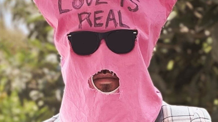 When I’m in public, I wear a pink bag over my head and sunglasses to cover my eyes. I write “love is real” across my forehead. There are a lot of reasons I conceal my identity. I’m usually tackling political topics in my work, so I partially do this out of safety, but I also find that presenting myself as a symbol instead of a person has a lot of power. In a lot of my erotica work, there are living objects, and in some ways this turns me into a living object.