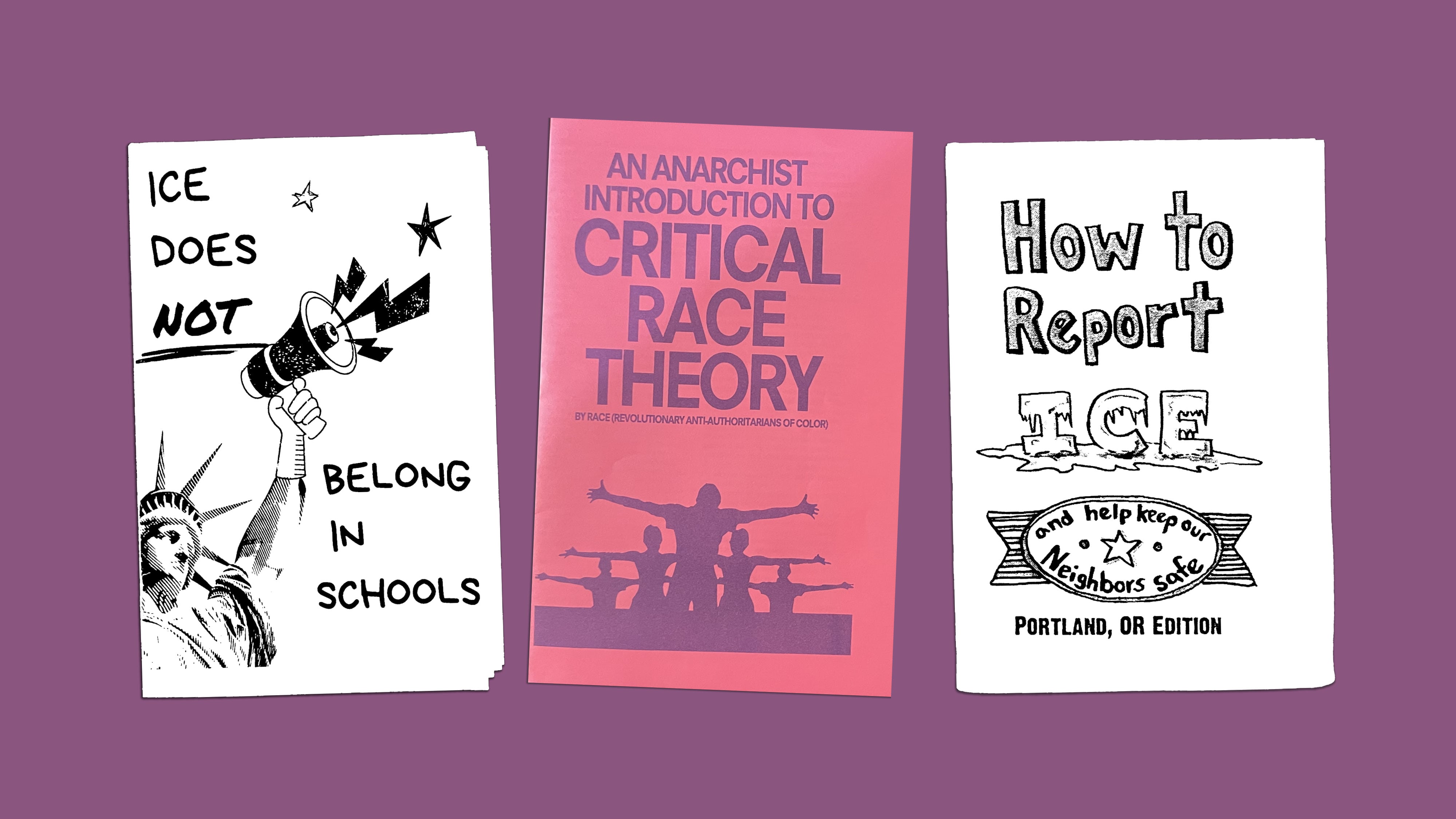 Eight-page zines like How to Report ICE by Megan Piontkowski and ICE Does Not Belong in Schools can be found around town in free library boxes, and both sit on resource tables and in the zine library at Portland Community College’s Cascade Campus. Both offer straightforward resources like rapid response plans and ICE hotlines, as well as more complex tools for community members navigating immigration, filling a vacuum created by our current dearth of trustworthy sources. Similarly, Well, How Did I Get Here asks eight pages’ worth of questions, the answers to which very clearly explain precisely how we got here.