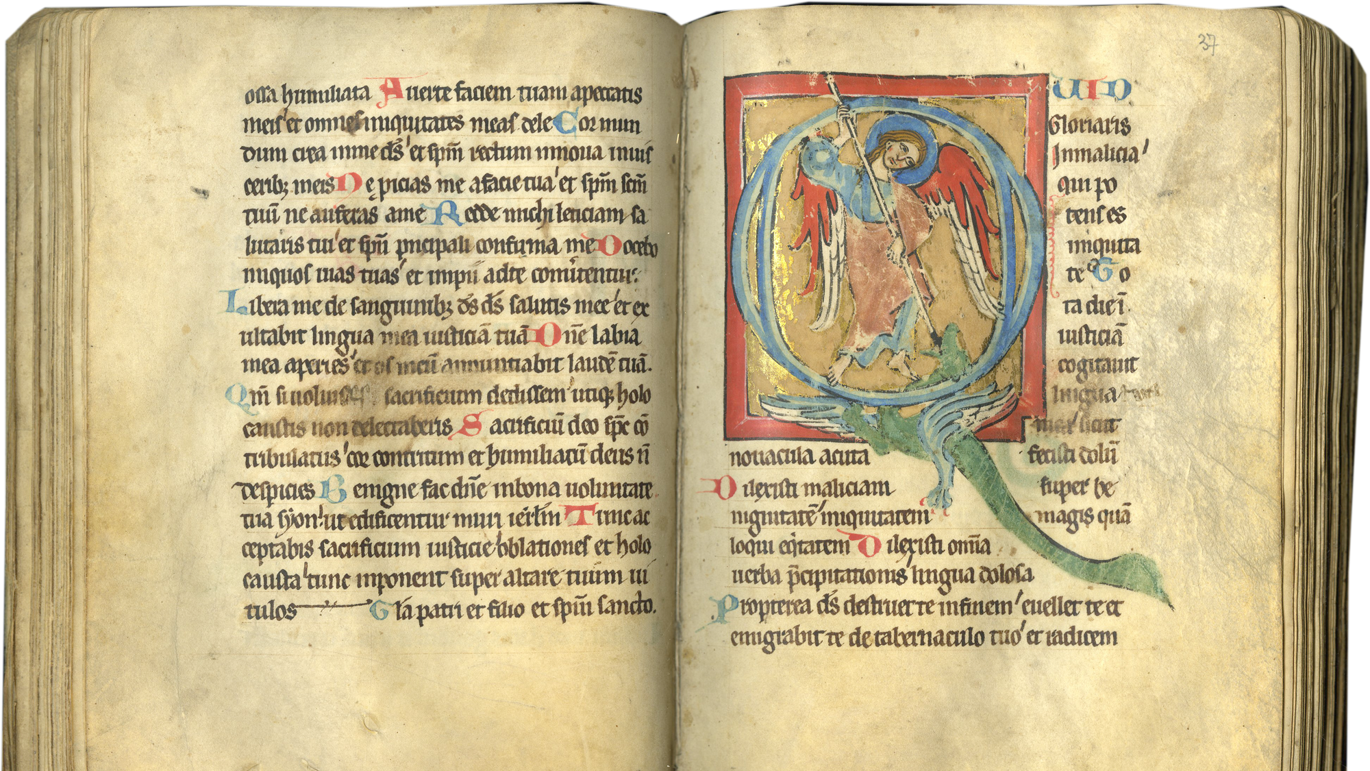 A Psalter (a standalone book of Psalms) open to a page showing the contest between the Archangel Michael and the dragon. (Courtesy Lewis & Clark College)