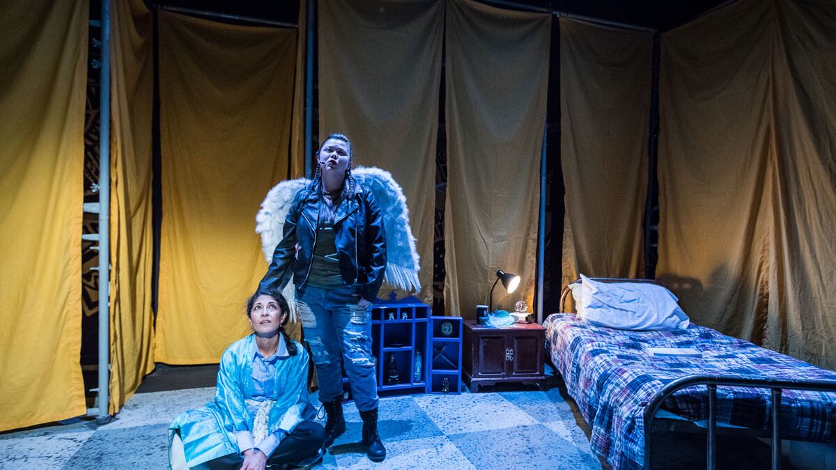 Caught in the madness is Marisol (Yolanda Porter), a young Puerto Rican woman who works in publishing. Early in the play, she's visited by a leather-jacket-wearing angel (Bianca Murillo) who announces the coming battle with God, which will apparently end humanity's suffering. Instead of joining the holy war, idealistic Marisol decides to search for her missing friend June (Trishelle Love), who has a serious head injury, and her brother Lenny (Alex Albrecht), who, in defiance of modern science and male anatomy, becomes pregnant.