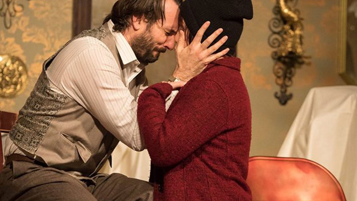 The set is simultaneously ornate and drabby. Gold-leaf wallpaper surrounds a floor covered in dusty rugs and vodka bottles. Below the house lights are a dozen or so dangling lamps, and the walls that frame the stage are covered with mirrors and polished metal platters. It has an eerie effect throughout, trapping and focusing the light, imbuing the stage with a vaguely supernatural characteristic.