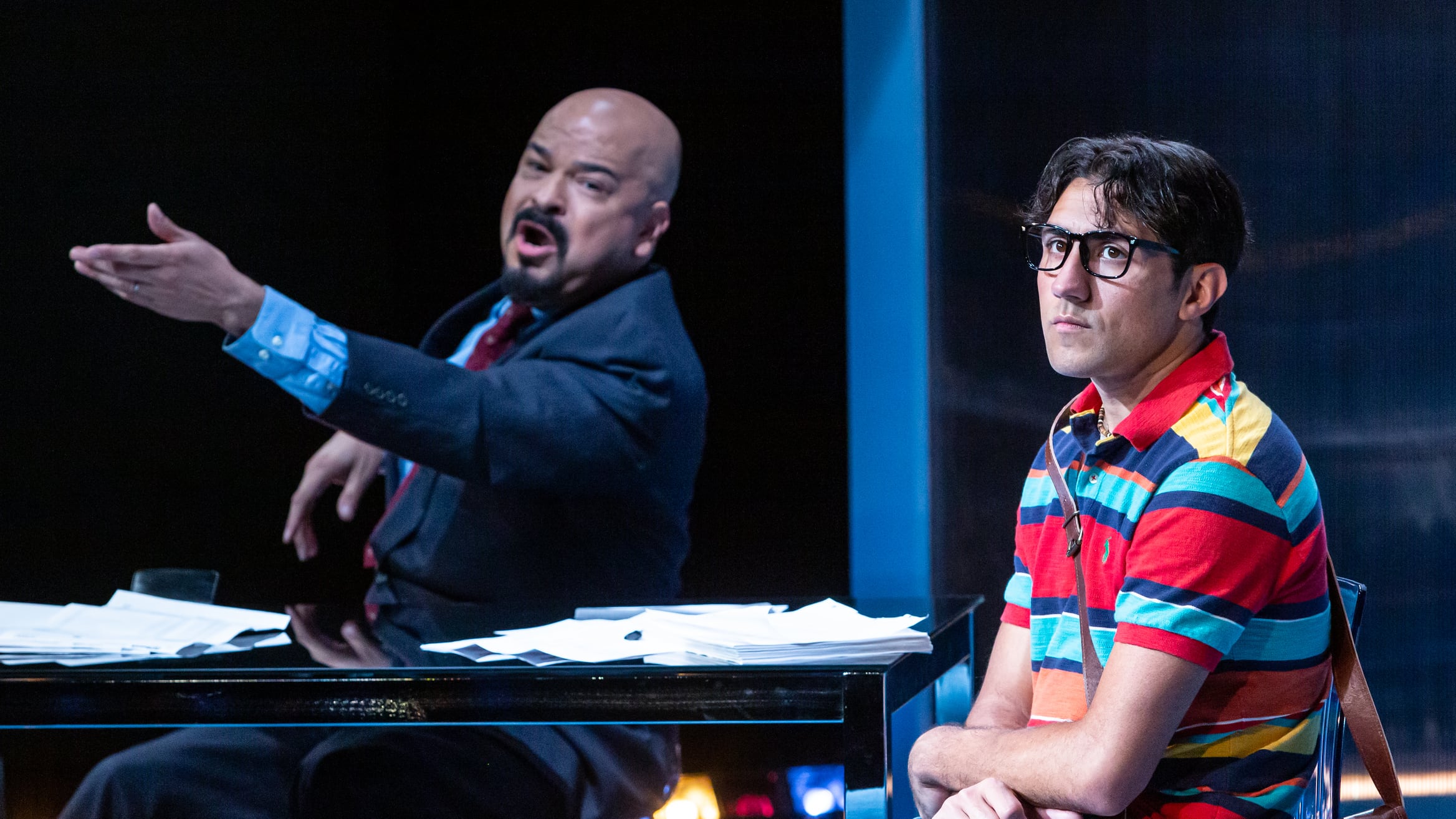 Greater conflict erupts from fissures of race and class and compels the young man’s coming of age. The audience collectively holds its breath watching Orlando lash out against his father’s biggest client, whose condescension toward Mando—”don’t beg, it’s embarrassing”—shows professional success does not equate with acceptance. In a blistering monologue, Mercedes (Crystal Ann Muñoz), Mando’s secretary and the only female character, lets reality strike Orlando. “I watched you go from being one of us to one of them.”