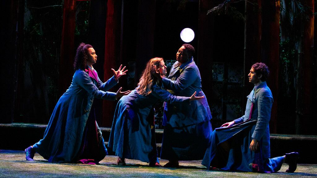 The play begins in Athens, where the awful father of Hermia (Nicole Marie Green) is wielding his patriarchal power by ordering her to marry Demetrius (Jesse Weil)—no matter that she loves another man, Lysander (Treasure Lunan). Lysander and Hermia escape into the woods, followed by the spurned Demetrius and Helena (Tyler Andrew Jones), the woman who loves him.