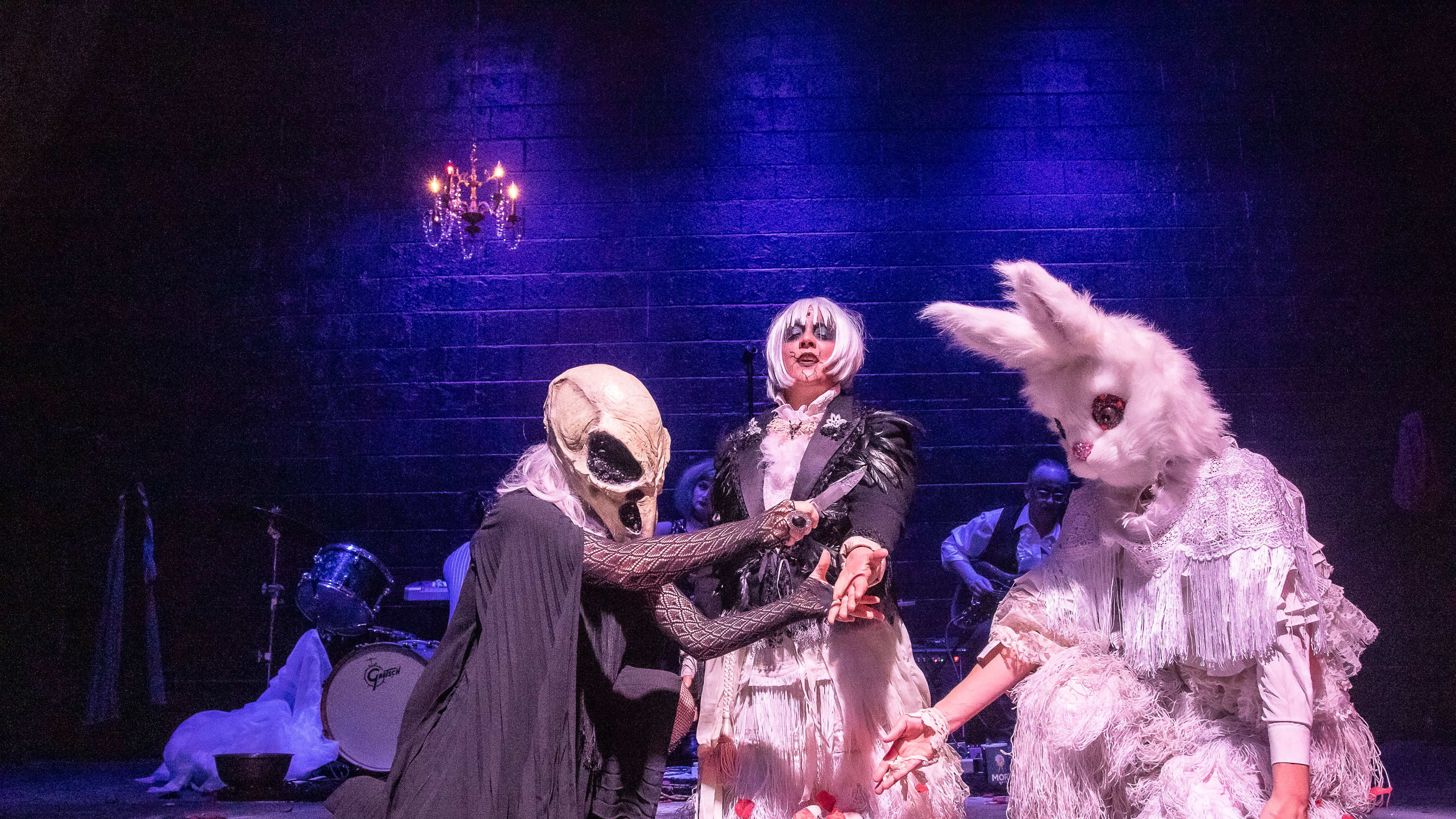 Beyond that door lies a darkened stage, where you witness a trio of mischievous spirits (played by Rebecca Lingafelter, Cristi Miles and Amber Whitehall) reckon with their post-mortal existence with the help of an accompanying band (the musicians are Kora Link, Ezri Galban Reyes and Mark Valadez).