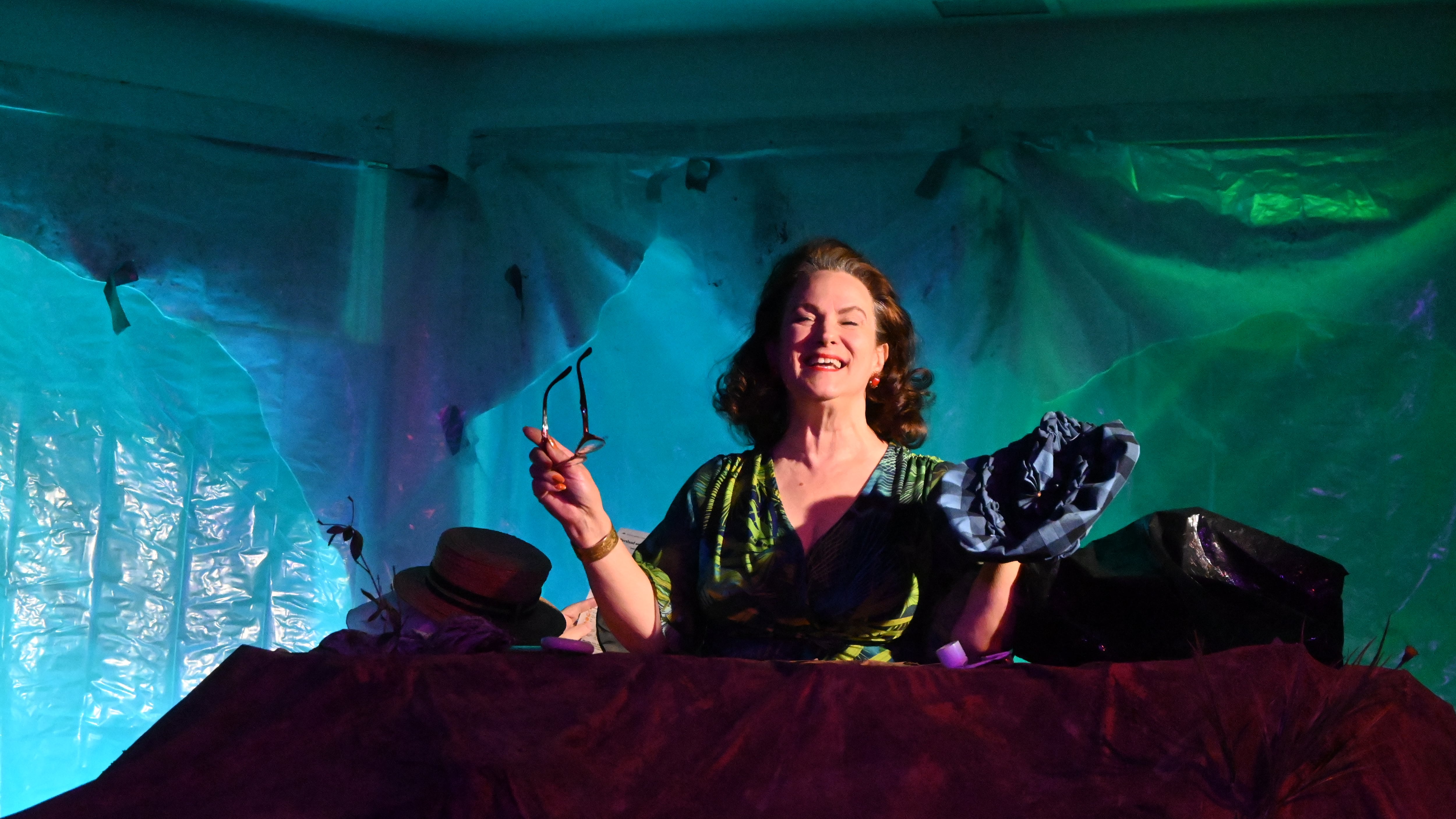 In the mall’s vacant Victoria Secret, 50 stools and folding chairs face a red curtain that parts and reveals a small circular stage. Buried waist-deep in a mound of earth, Winnie (Diane Kondrat) begins the day with a prayer. She then takes from a black plastic bag with great care her daily items—a toothbrush, a handheld mirror, a hat and a revolver named “Brownie.”