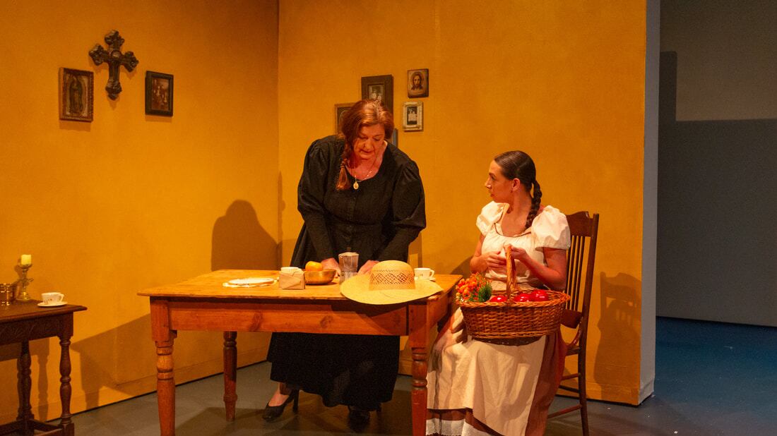 That cycle is embodied by a scene where Leonardo’s Wife (Sammy Rat Rios) and her mother (Marilyn Stacey), who’s simply called “Mother-in-Law,” sing with sorrowfully sweet voices, trying to lull the Wife’s baby son to sleep, only to have Leonardo later wake the infant by shouting at his wife to shut up. The Wife and the Mother-in-Law, who are both dressed in drab sage-green garb (designed by Paige A. Hanna), then resignedly resume their sad lullaby while Leonardo takes off on his horse.