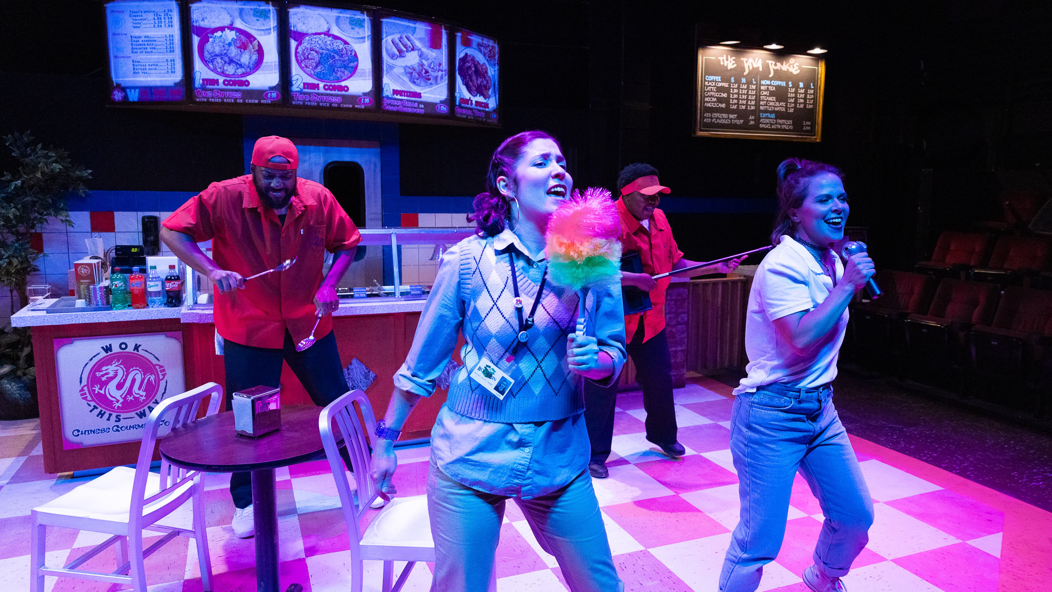 Fueled by a mutual love of karaoke, four BFFs in 1998 take a break from their boring jobs to perform Journey’s “Don’t Stop Believin’,” which turns into a rollicking joy fest, with Carly (Alex Ramirez De Cruz) using a fluffy rainbow feather duster for a mic and Ash (Treasure Lunan) strumming a long-handled dust pan as if it were a guitar.