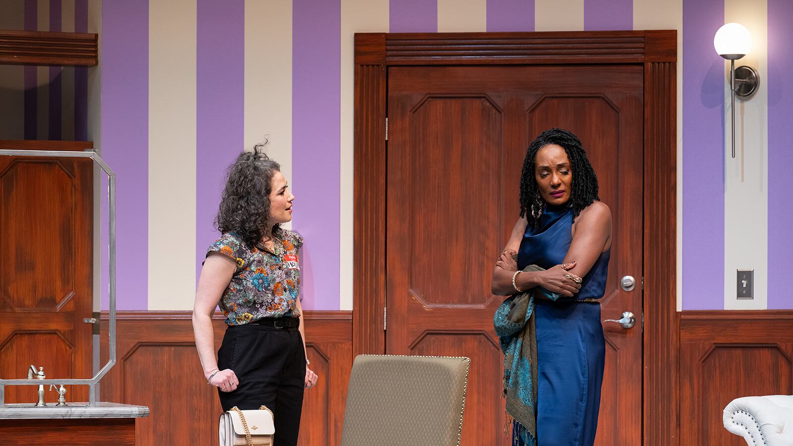 In addition to themes of truth and memory, the play explores the complexities of privilege. Externally, the two characters invert the expectations that their ethnicities would place upon them. Aisha, who is Black, is a successful and stylish playwright (she wrote the titular play), and wears elegant braids with a head-to-toe blue silk ensemble accented by a luxurious teal pashmina scarf. Holly, who is white, has yet to break into standup comedy, reflected by her vintage wardrobe of faded floral prints, dated high-waisted pants and voluminous flyaway hair.