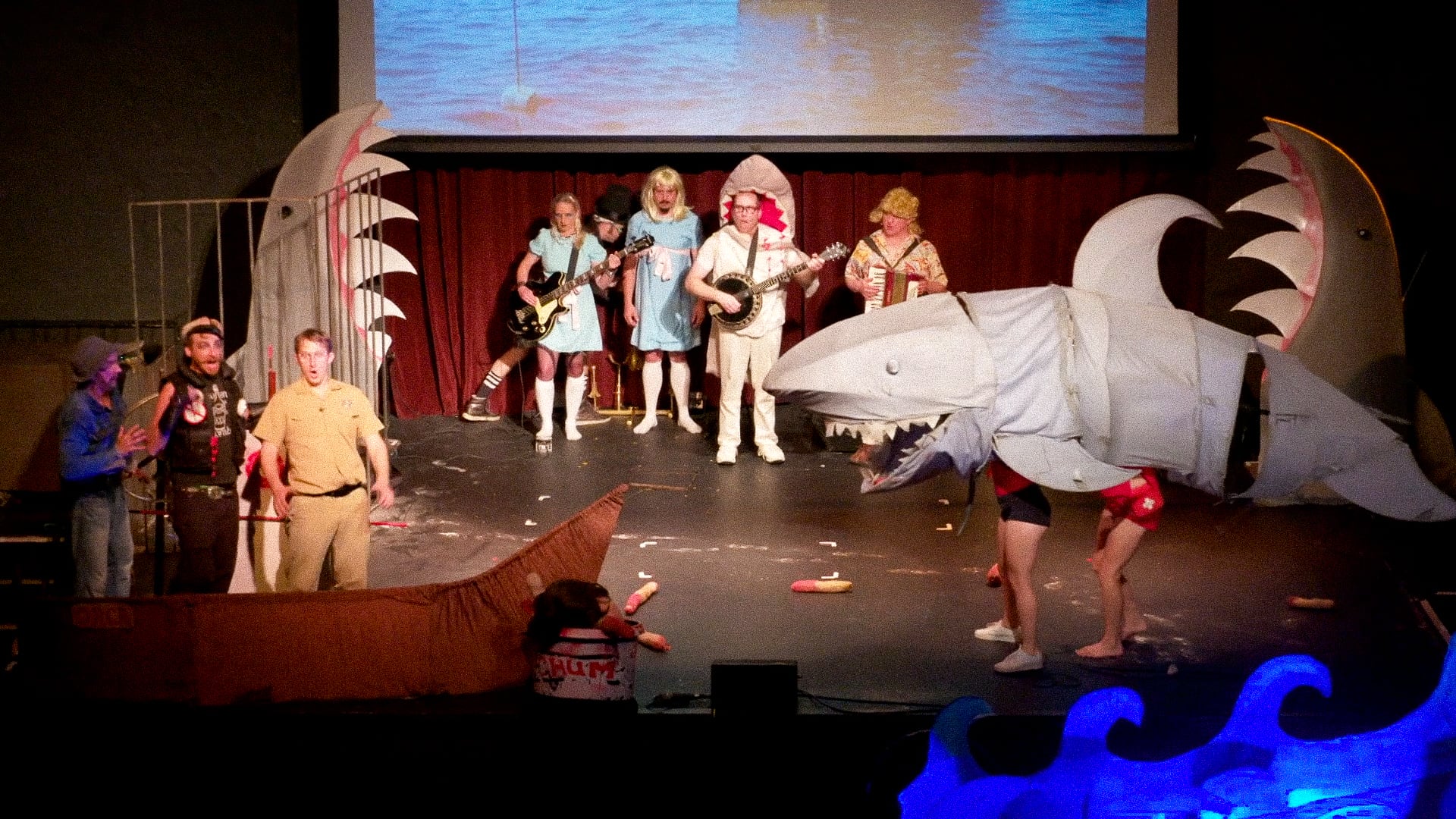 A whole musical around cinema’s most famous two-note leitmotif? The Saloon Ensemble (formally stylized as The SaLoOn EnSeMbLe) did it around a decade ago when it first staged J.A.W.Z. the Musical—in 3D!, a theatrical parody of the classic shark movie Jaws. And just when you thought it was safe to go back in the water, J.A.W.Z. the Musical—in 3D! returns to the Alberta Rose Theatre to celebrate not only the musical’s 12th anniversary, but its namesake’s 50th anniversary too.