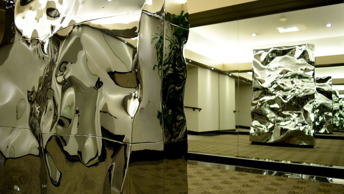 Sculpted by local artist Bruce West in 1973, the untitled work is displayed inside a hall of mirrors that reflect the sculpture infinitely back and forth—a weighty monument to light and distortion.