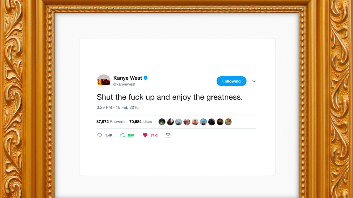 Katz also sells tweets on Northwest 23rd—lining up a selection of framed tweets on the sidewalk across from a Salt n' Straw—in case you have 50 bucks lying around and want to buy a framed tweet by Kanye about getting emotional over fonts.