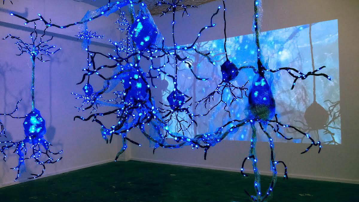 But to the casual viewer, the netting is as inconsequential as it was to scientists in the century before Harkness' discovery. There's no mention of perineuronal nets in the gallery, and no explanation of what Harkness actually did. The only hint is a caption to a video of up-close shots of the neuron sculptures projected at the back of the room: "Inspired by groundbreaking research in memory and addiction."