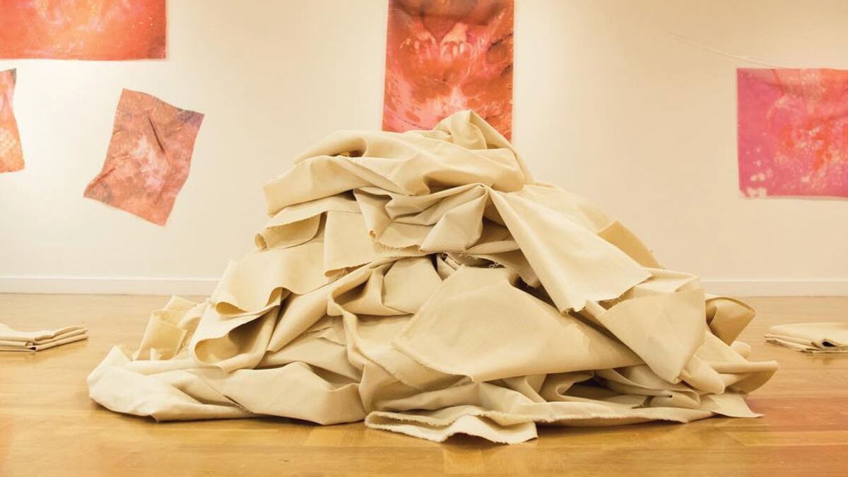 Rosen's book is displayed on a podium at the far end of Portland State University's Littman Gallery, where Killjoy Collective is hosting its second show outside of its hard-to-find gallery in Southeast Portland. Sun Kittens & Moon Puppies lends the exhibit its name and, in a way, its manifesto. The show as a whole attempts to imagine what the world will look like after the fall of the patriarchy. To Rachel Rosenkoetter, it will look like vibrant paintings of exploding eggs. To E.M. Fuller, it will look like large ribbons of raw denim arranged in a pile shaped like a lopsided pyramid. To Maggie-Rose Condit, the impending social change will look like red-tinted photographs of hands clawing at cherries.