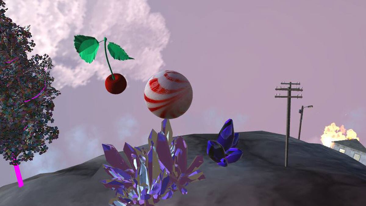 Nikolai has created a series of worlds in a more literal way, too. Nikolai's video game depicts an asteroidlike planet rotating in the void of space. The program loops through several different settings, and visitors can rotate the asteroid using a glittery, bowling ball-sized orb. In one setting, the floating rock looks like it's undergone an apocalypse—there are trash cans on fire and a cop car that gets thrown around like a toy when you rotate the asteroid. Others are more serene, like a scene with crystals, a purple tree and a floating cherry.