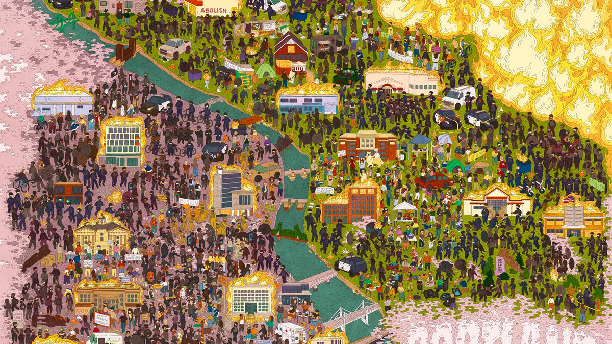 To see more of Grafera’s work—and download a coloring book version of Portland: Year of Protest—visit grafera.zone. Archival-quality prints are also available to order at buyolympia.com/Item/luka-grafera-portland-year-of-protest-print.