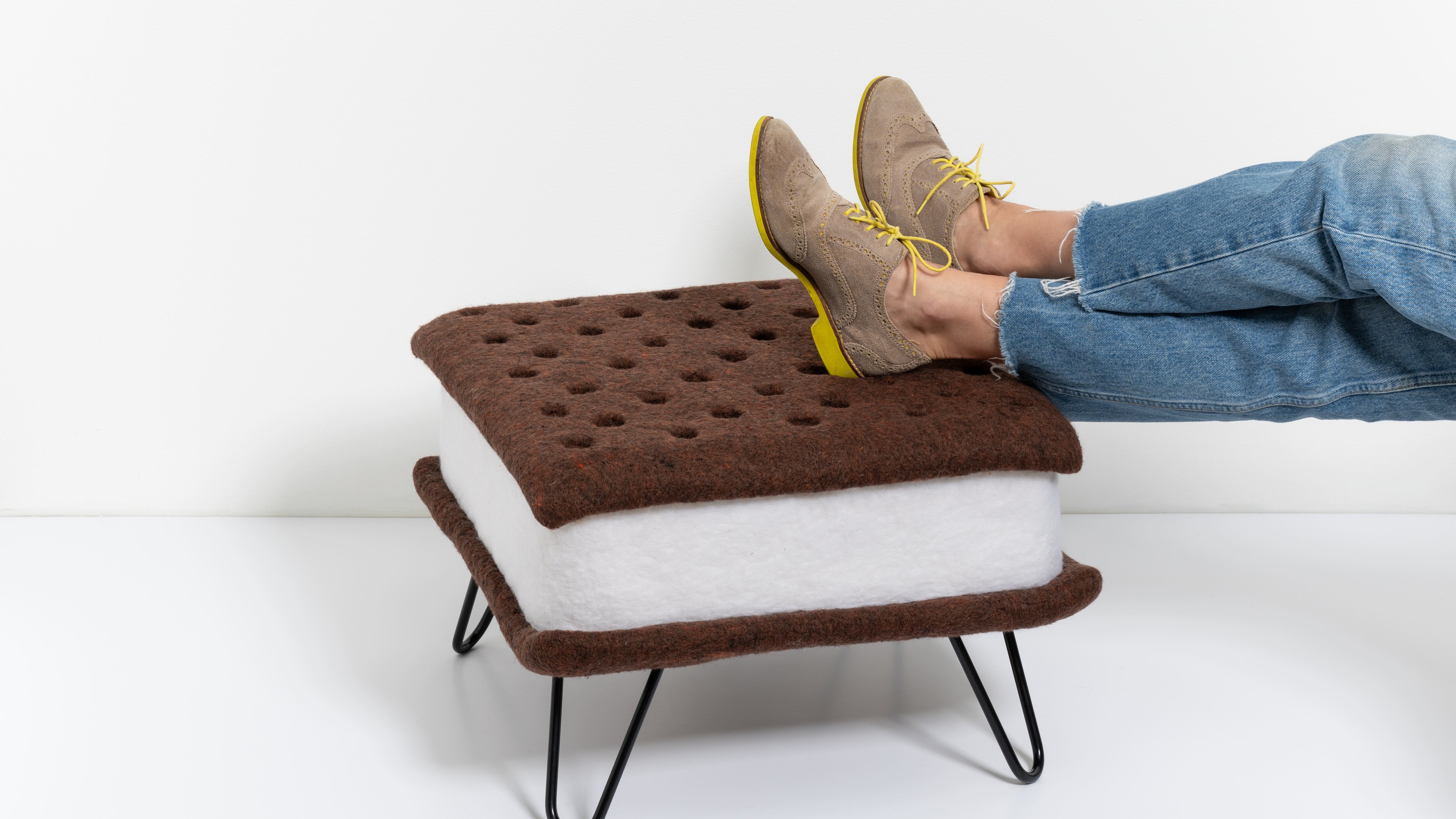 The Cheez-It chair is most lifelike in gallery documentation photos. Textured enough to beat AI allegations, Nine Gallery’s photos of Rich’s chair require a deep study to notice fibers. A quick glance immediately elicits excitement. Is that a giant cracker? How’d she do it and why do I want to sit on it even though it could break immediately? It’s nothing deep enough to overthink. Cutting out processed sugar and salted morsels likely isn’t enough to see Rich’s work and feel a wave of revulsion or think about the geopolitical mechanisms that prop up the Nabisco. Honestly, with what life seems to throw at us intellectually, why not bask in the simplistic wonder of seeing a footstool in the shape of an ice cream sandwich or Nutter Butter cookie?