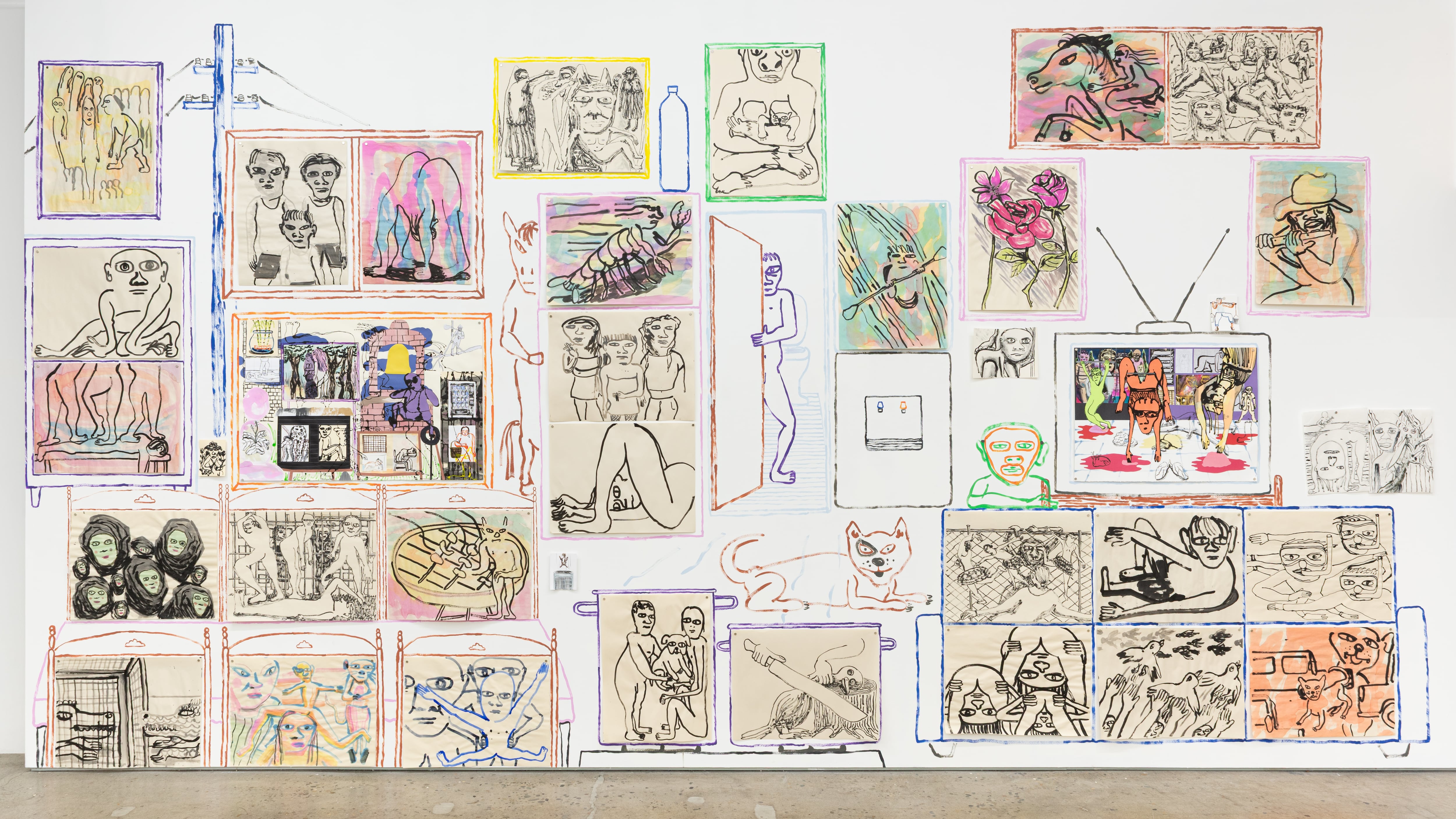 Ralph Pugay’s ShagriLIEF is warm, enchanting, and funny—clever, amorous, surreal scenes painted right onto the walls and layered with hundreds of drawings hung in an obscure salon-style formation. Violet hibiscus are drawn in bloom on the white gallery wall—alongside a man in an eye patch and other mysterious figures hanging out between petals and leaves. One minute you’ll notice a guy in a G-string flexing, the next an anthropomorphic snail person slowly moving along, bodies coalescing, bending, stretching. Every piece of work was vibrant, gestural and playful. ASHLEY GIFFORD.