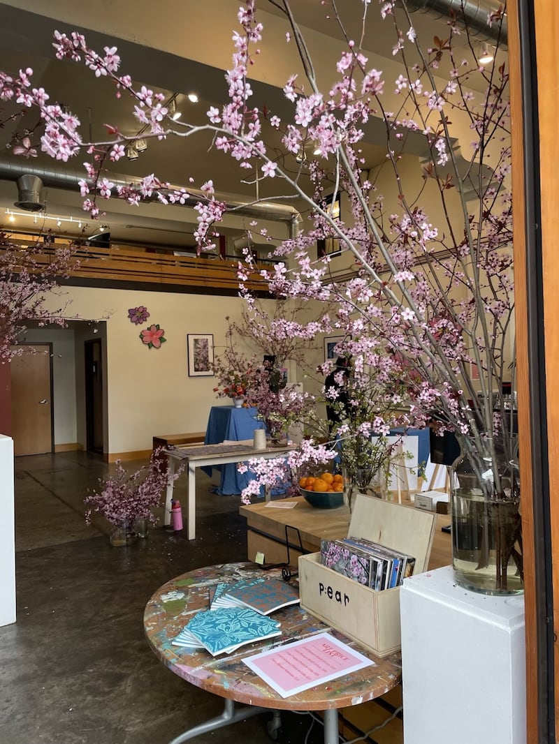 In preparation for the event, the youth participating in p:ear’s Art Works program did collaborative art pieces, painting cherry blossoms on wood or exhibiting photos taken throughout Old Town of cherry blossoms that were sold from the walls of the gallery space. Through p:ear’s Works programs, youth baristas in Coffee Works created an exclusive drink menu of seasonal drinks, the Flower Works program made flower wraps and sold bouquets, and also created the pop-up’s central floral installation using cherry blossom branches tall enough to tower over the entire proceedings, much like the trees on the waterfront form a pastel canopy to herald the return of spring. In this way, the event paid tribute not only to Sakamoto and the changing of the seasons, but also the strength and resilience of a community that supports each other despite the odds.