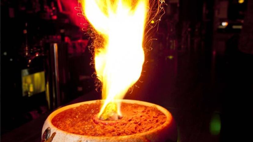 The first thing you hear will most likely be the thunder, followed by a roar of "WHOA!" as a giant flame flares up and back down, affixed to a piece of charcoal on a lime slice in the center of a cauldron filled with mint leaves, flowers, giant long straws and a whole lot of rum. At Northeast Broadway's Hale Pele, you feel like you're in the best little bar in fake Hawaii—one where the servers wear Hawaiian shirts, the menu is an actual book of drinks with illustrations, and everywhere you look, there's sea glass, a tiki pillar or a cloud of fog from a smoke machine. That menu can be dense, filled with illustrations of pineapple garnishes and tiki drawings marking the alcohol level in each drink. Here's a guide for ordering: If you definitely don't want to risk $9 on an unknown drink, get the piña colada ($10) or the chi-chi ($10). If you do want to risk $9 on an unknown drink, go for the Lapu Lapu ($12). And if you're there for the flames, get the volcano bowl—if three other people at your table want it. But if you're the only person going full-in, you can get the Jet Pilot ($12), a fire drink for one. Pro tip: It's not on the menu, but there's a volcano bowl that serves two ($25).