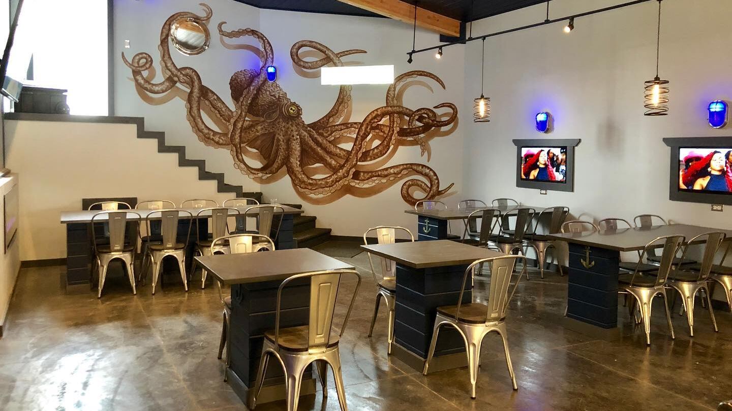 Becksted, a lifelong Newport resident and real estate developer, says he saw a hole in the city's brewing scene and wanted to do something completely new. The result is a sleek, industrial chrome-accented space with 20 taps and extraordinarily detailed nautical touches, like the sprawling orange octopus mural on a side wall along with an oversized anchor covered in barnacles that looks like it's ripping through the front of the building.