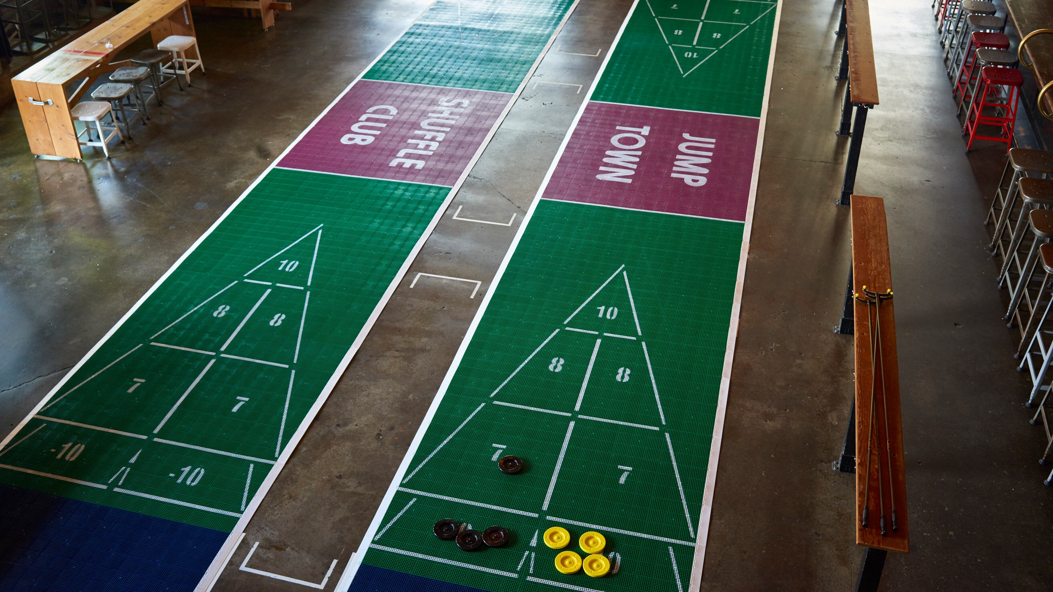 "There was a place in Seattle I used to play shuffleboard with my friends after work," says Bowden "and when I got talking with one of the partners here about a different way to use the bar in the summer, we realized we both loved floor shuffleboard but couldn't find it in Portland. Since we have a space big enough for the courts, we thought, why not?"