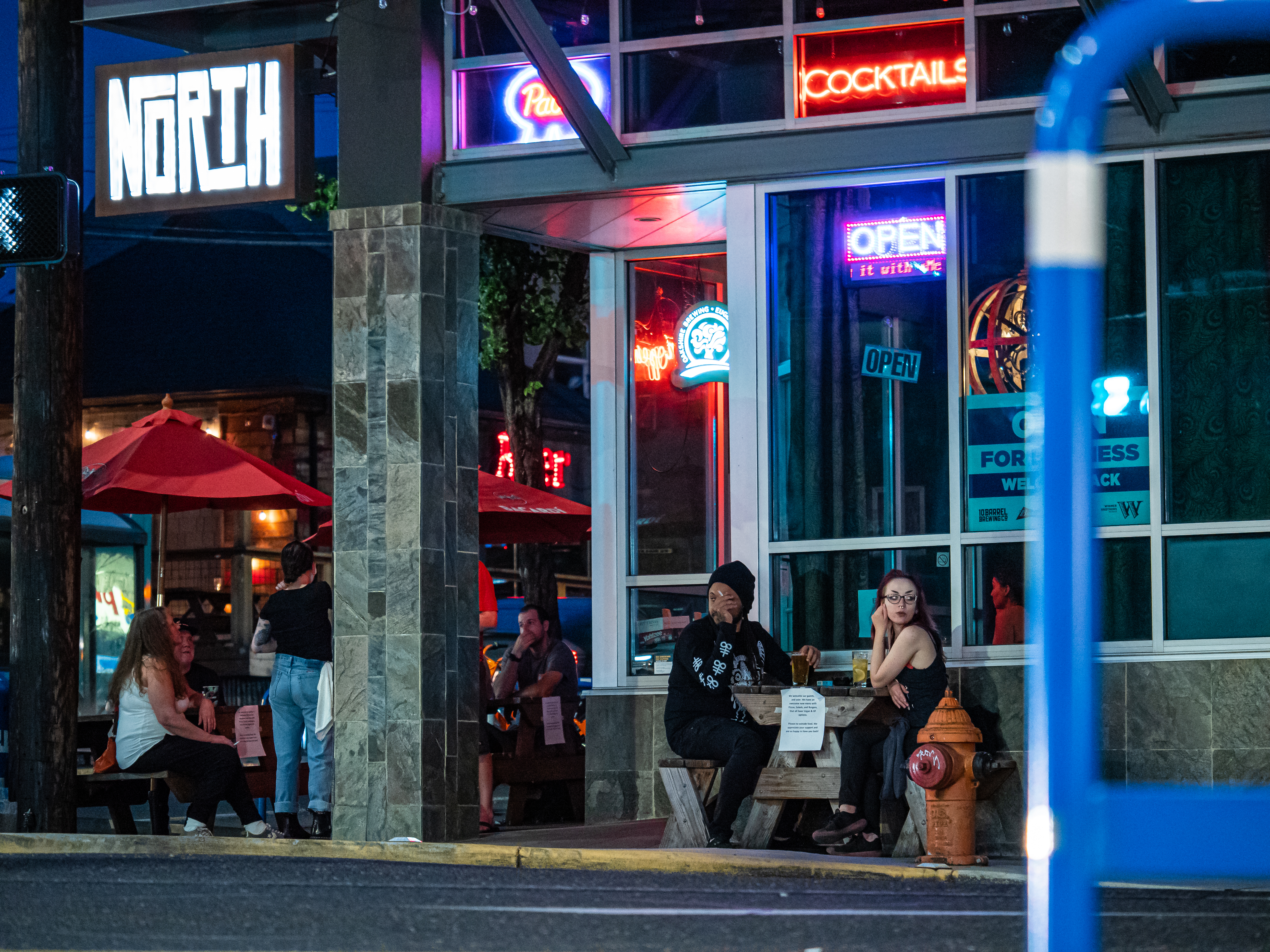 Per the governor's orders, during this first phase of reopening for Multnomah County, all bars and restaurants must stop serving customers at 10 pm. And while the crowd at this University of Oregon-supporting sports bar didn't appear to get the message about wearing masks indoors, it sure seemed aware of the early closing time: At a point of the night when most clubs would normally be mixing their first vodka sodas, the place was at maximum capacity. A slew of young professionals socialized on the boardwalk outside, as club music bounced.