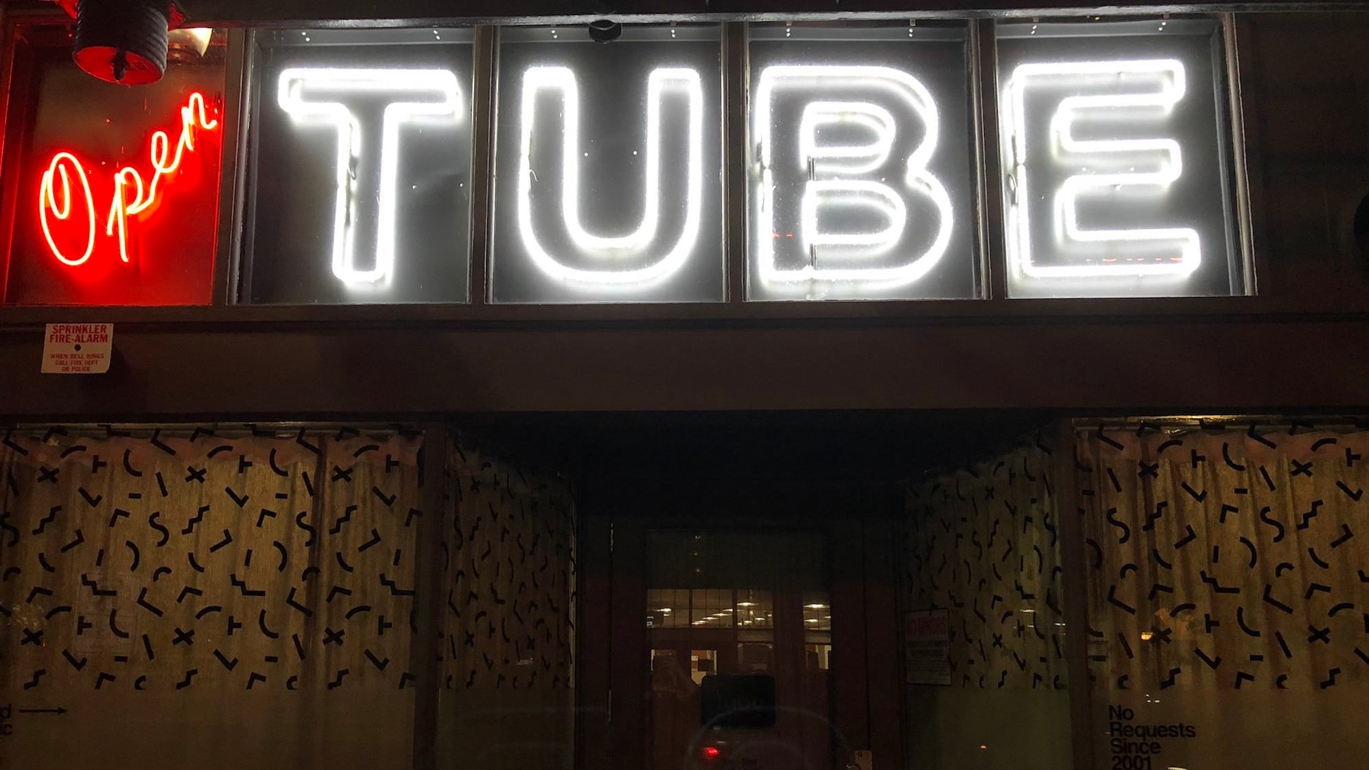 The Tuesday night opening celebrates “Tubesday,” a long-standing DJ night dance party with DJ PHNM that occurred regularly before the shutdown. The feeling is nostalgia. The DJ booth neon lettering still reads, “NO REQUESTS.”