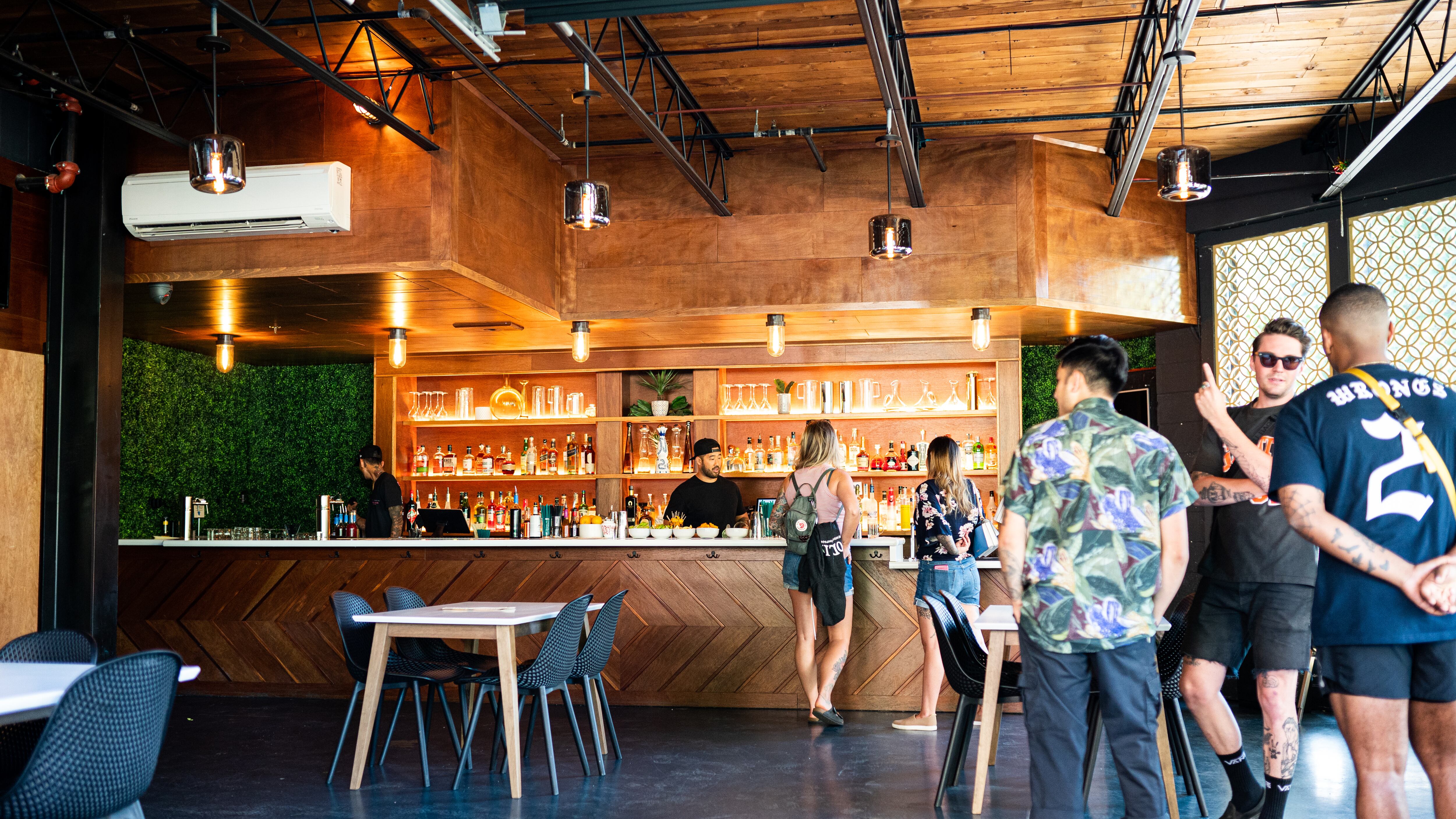 Jackie’s indoor bar is its largest and was also its least busy, even with the added allure of air conditioning. Century Bar’s old frosé machine didn’t make a comeback, but Jackie’s offerings fit the space’s legacy of modern spins on old standards. The kitchen’s snacks run the route of healthful and unique, with items like basil and goat cheese hush puppies, swordfish tacos, and watermelon salad.