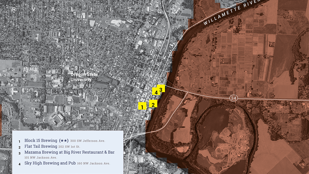 HIGH RISE / Sky High is Corvallis' Empire State Building. That may sound like an exaggeration—it's only four stories tall—but in the city's adorable Main Street, U.S.A.-style downtown, that makes it a skyscraper. An elevator shoots you straight to one of the best patios in the Willamette Valley, but take the stairs to explore every inside layer, including mezzanine seating that's basically an observation deck hovering over the 10-barrel system. That's where head brewer Paul Harwood has been improving his techniques since 2014, following some hands-on experience at nearby Oregon Trail Brewery, the long-standing training grounds for many of Corvallis' beer makers. He can now successfully execute everything from a biscuity, true-to-style Bohemian Pils to a winter ale that seemingly uses the reclaimed bones of every gingerbread house in town. But a recent standout was St. Filbert's Porter. As the name suggests, Harwood brewed the beer with buttery hazelnuts grown on nearby Kiger Island, resulting in an ebony sipper with notes of chocolate. Take it to the sprawling rooftop bar and slide into an Adirondack—the best seat in the house to watch the sun slip behind the expansive Coast Range. Andi Prewitt.