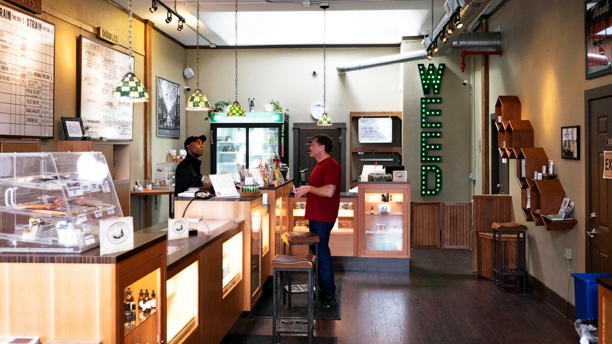 Collective Awakenings is one of the Green Mile's original medicinal spots, and it certainly shows throughout its mildly groovy lobby. A massive tree coated in lacquer is an instant eye-catcher, but it's the oil painting of a hazy forest covered in mushrooms that brings to mind the '90s stoner art aesthetic Spencer's Gifts helped make popular in the alt-rock era. The sales area, on the other hand, has cleaned up quite nicely since the switch to rec, offering a bright and sleek space in which to browse. After the front desk calls back for help with a walkie-talkie, you're paired up with a budtender who offers flower at one of three identical stations. Clients are given a pair of wooden tongs and a lighted magnifying glass to inspect the nugs, while a smattering of commonly available edibles and a small amount of vapes and oils round out the rest of the case. Be sure to check out the budget-bin selection of eighths, which had strains like Thin Mist GSC and White Tahoe Cookies starting at just $35.