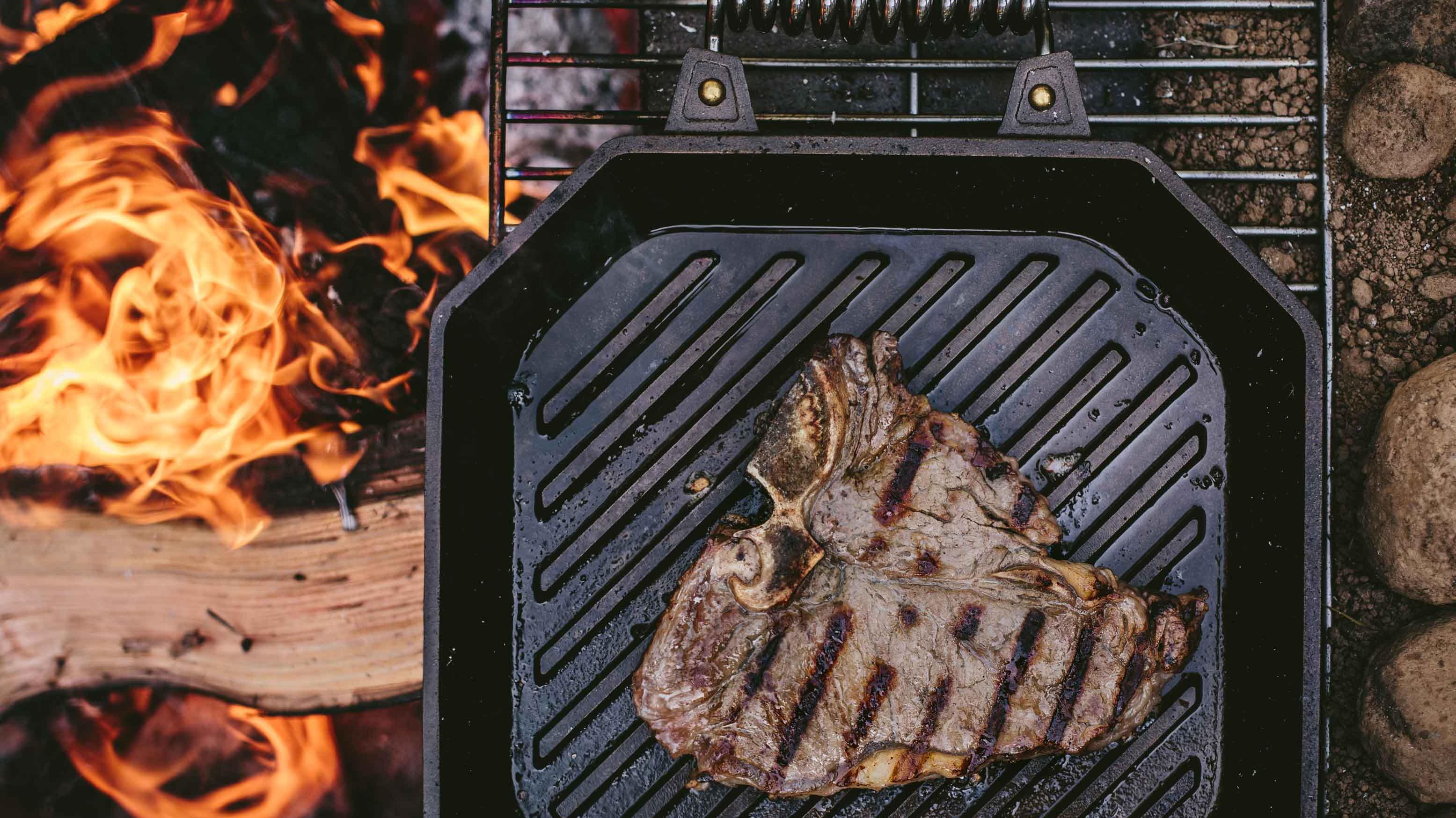 The Finex 15″ Lean grill pan ($99) is exactly what I needed. It goes on the stove inside, so I don't have to go outside on a cold, rainy day and futz with a charcoal chimney. It's a large rectangle so I can fit three or four steaks on it at once, meaning no one has to wait for dinner. And, most importantly, it has grill-width ridges that give the meat the familiar look of a grill steak.