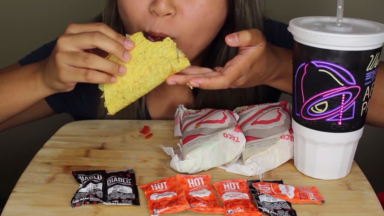 A woman eats three Taco Bell tacos and says things like, "Taco Bell Crunchy Taco is the best thing ever."
