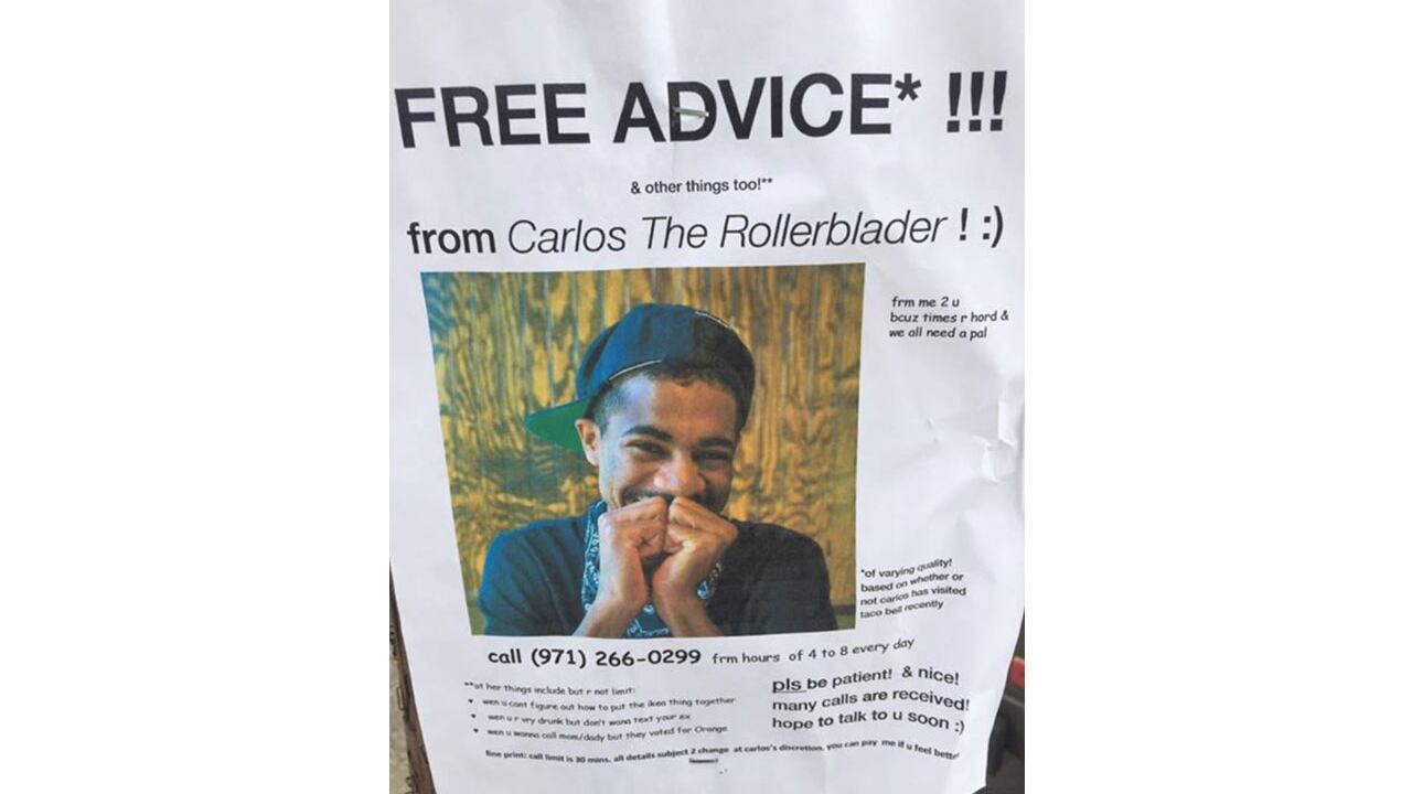 You may have spotted flyers around town offering "FREE ADVICE* and other things too" from Carlos the Rollerblader. Carlos' services come with the disclaimer that the advice is "of varying quality based on whether or not Carlos has visited Taco Bell recently."