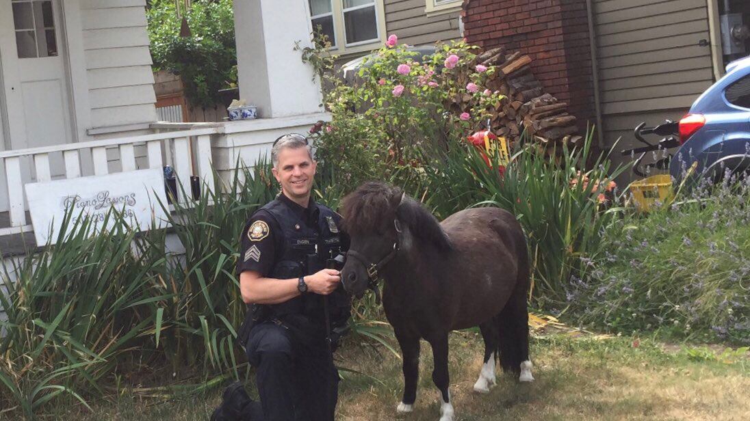 Portland police tweeted out images of an officer posing with the pony. Soon after, the owner was tracked down.