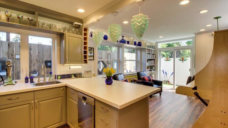 Most of the decorative touches are ornate and crafted by the owners. Fahrendorf's handmade stained-glass windows pay tribute to the brewing process by depicting mash tuns and fermenters. A frosted light fixture rescued from Goodwill got a fresh coat of paint so that copper-colored leaves now look like verdant bines sprouting from the ceiling. The most eye-catching element is the trio of electric-green hop pendants that illuminate the subway-tiled kitchen. Even the bathrooms are awash in beery ambience. Want to stay occupied on the toilet? Read pages from "The Comic Book Story of Beer" that wallpaper the room.