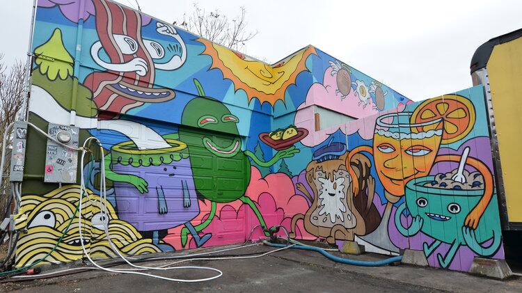 In April, Jon Stommel and Travis Czekalski, together known as the art duo Rather Severe, were hired by the owner of Southeast Hawthorne brunch cart Fried Egg I'm in Love to paint a mural on an adjacent wall with something in their signature style, viewable in all five quadrants—sprawling murals with thick, endless lines and brightly colored cartoon characters that look like Adventure Time on acid.