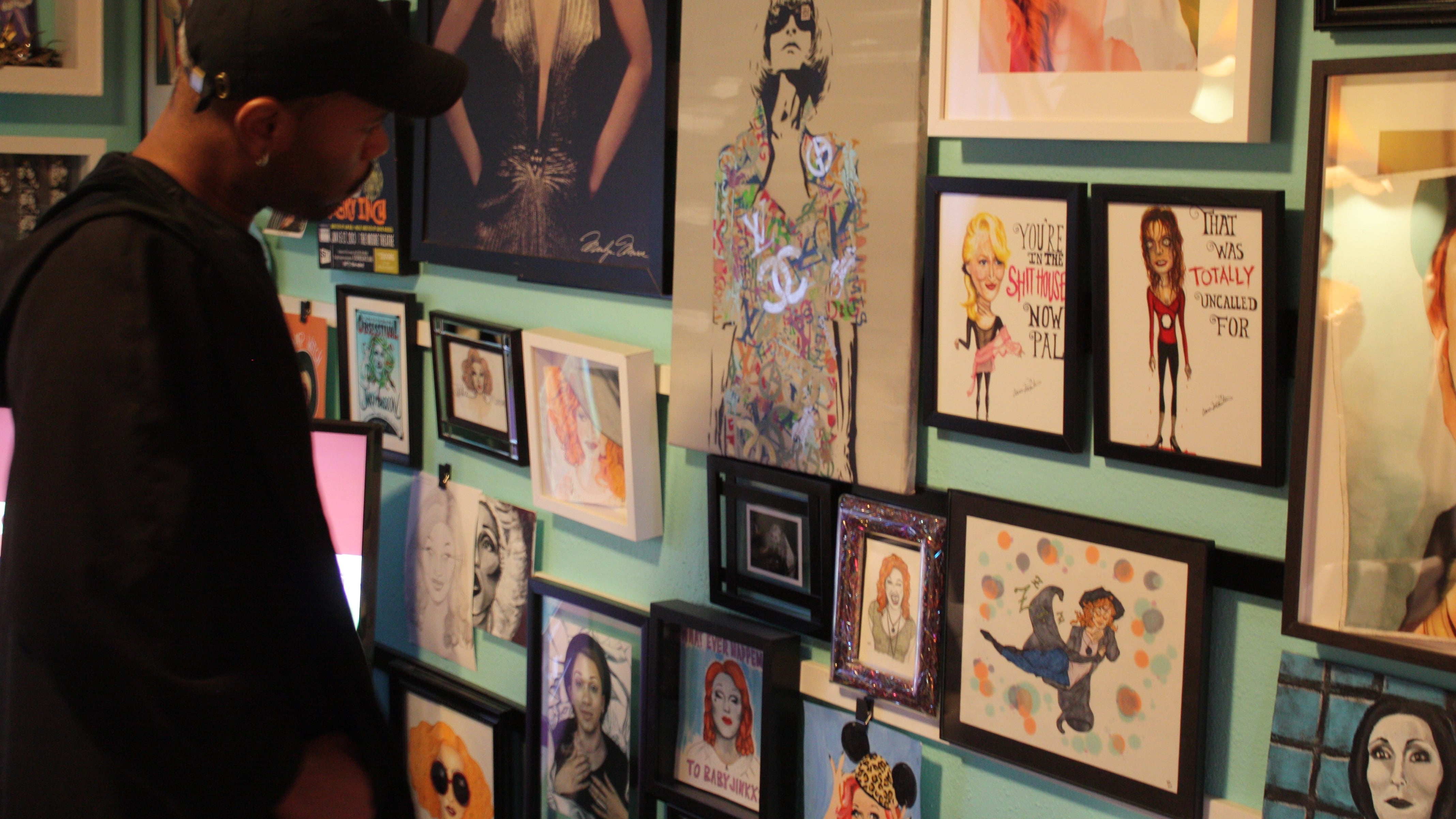 Like any grand celebutante, Monsoon has artwork of herself hung around the house, ranging from a tapestry in the second floor bathroom— which has an Instagram-ready clawfoot tub —to a fan art wall in the parlor. The parlor is also decorated with Monsoon's TV and stage costumes, and kitschy memorabilia ranging from Broadway vinyls and an Elvira photo to a collectable RuPaul doll and a library with Michelle Visage's new book.