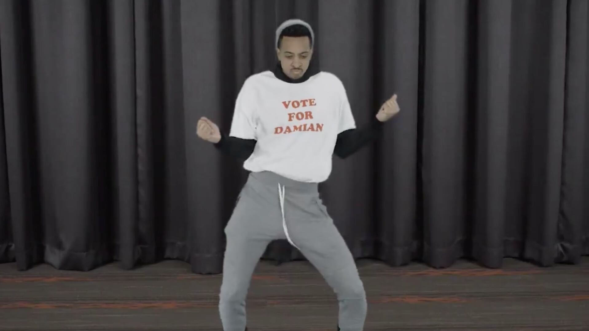McCollum, clad in a "Vote For Damian" shirt and moon boots shuffles in front of a green screen stage doing the Napoleon Dynamite high school assembly dance.