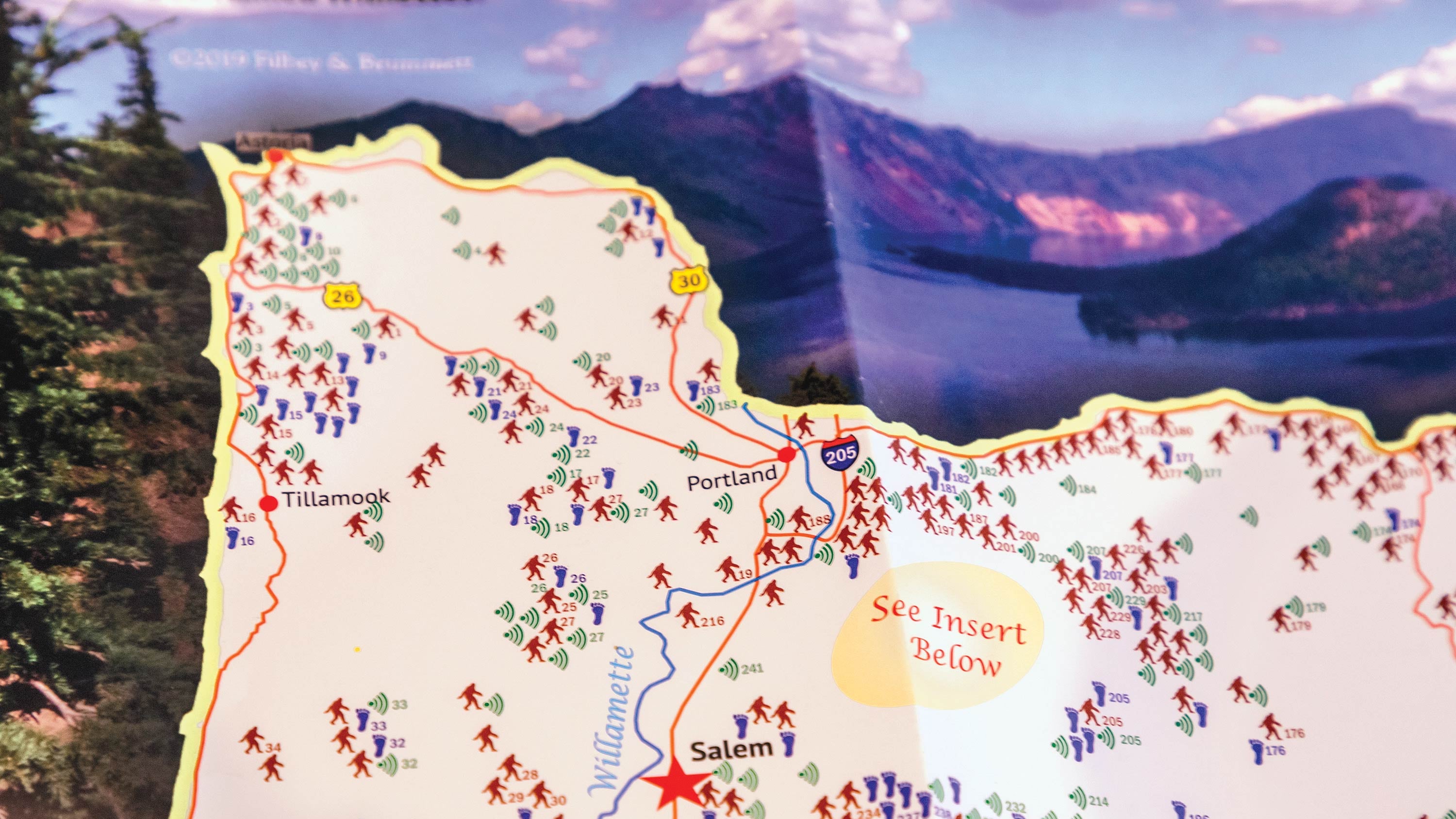 It took him three decades, but Filbey, who moved to the Rogue River two years ago, finally got around to finishing his Oregon map, which he sells as an illustrated double-sided poster at Bigfoot conventions and through his Etsy store. It features over 1,000 sightings across the state, along with an annotated guide to what he considers the most credible reports.