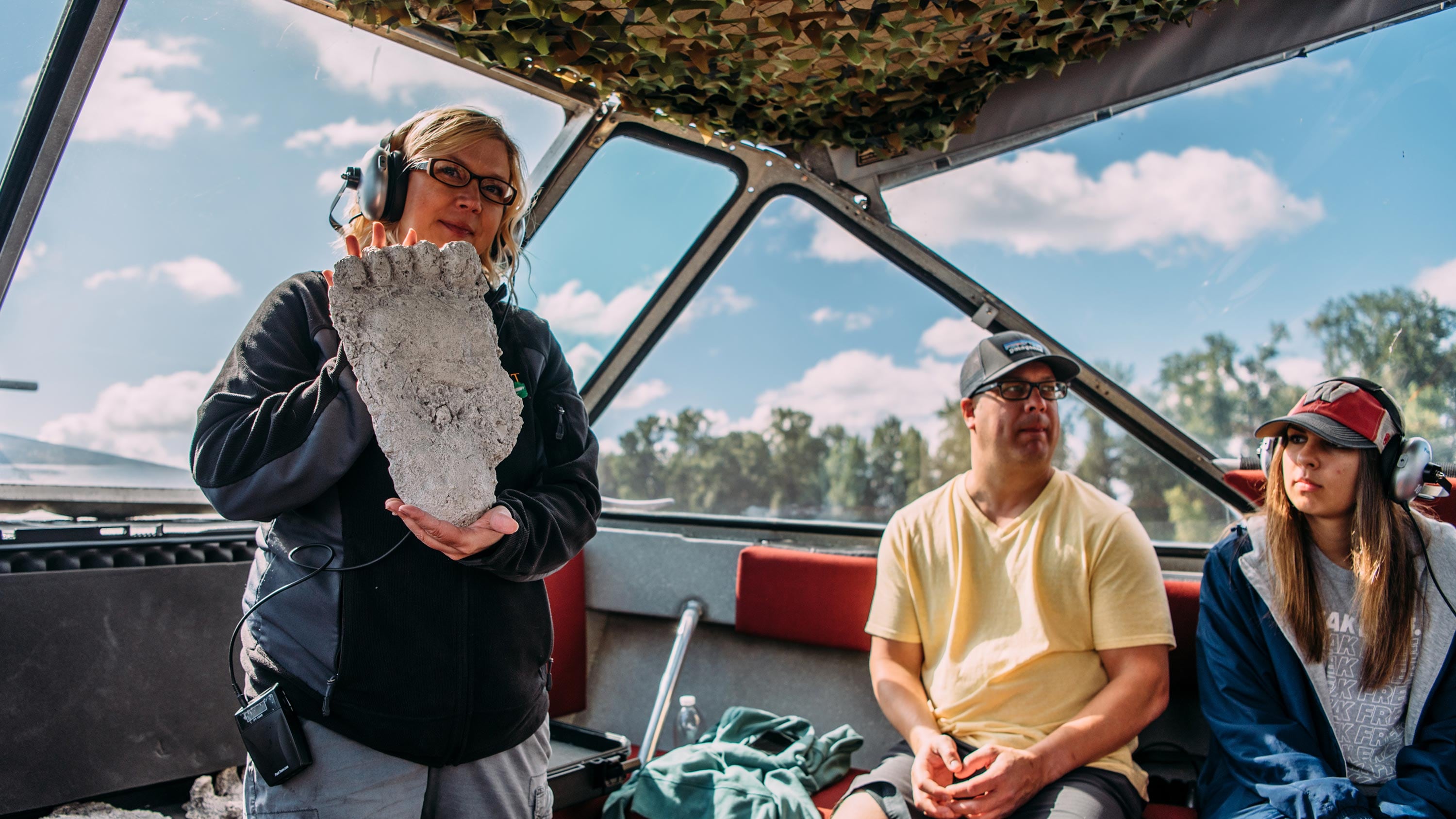 She heads to the bow, pulls a black, rectangular chest out from under the bench seat and unsnaps the lid. A couple across from me exchange an anxious glance and visibly shiver with anticipation. Farrah lifts what appears to be a large stone from the case and turns around to reveal it's actually the footprint cast of the Pacific Northwest's most fabled resident: Sasquatch.