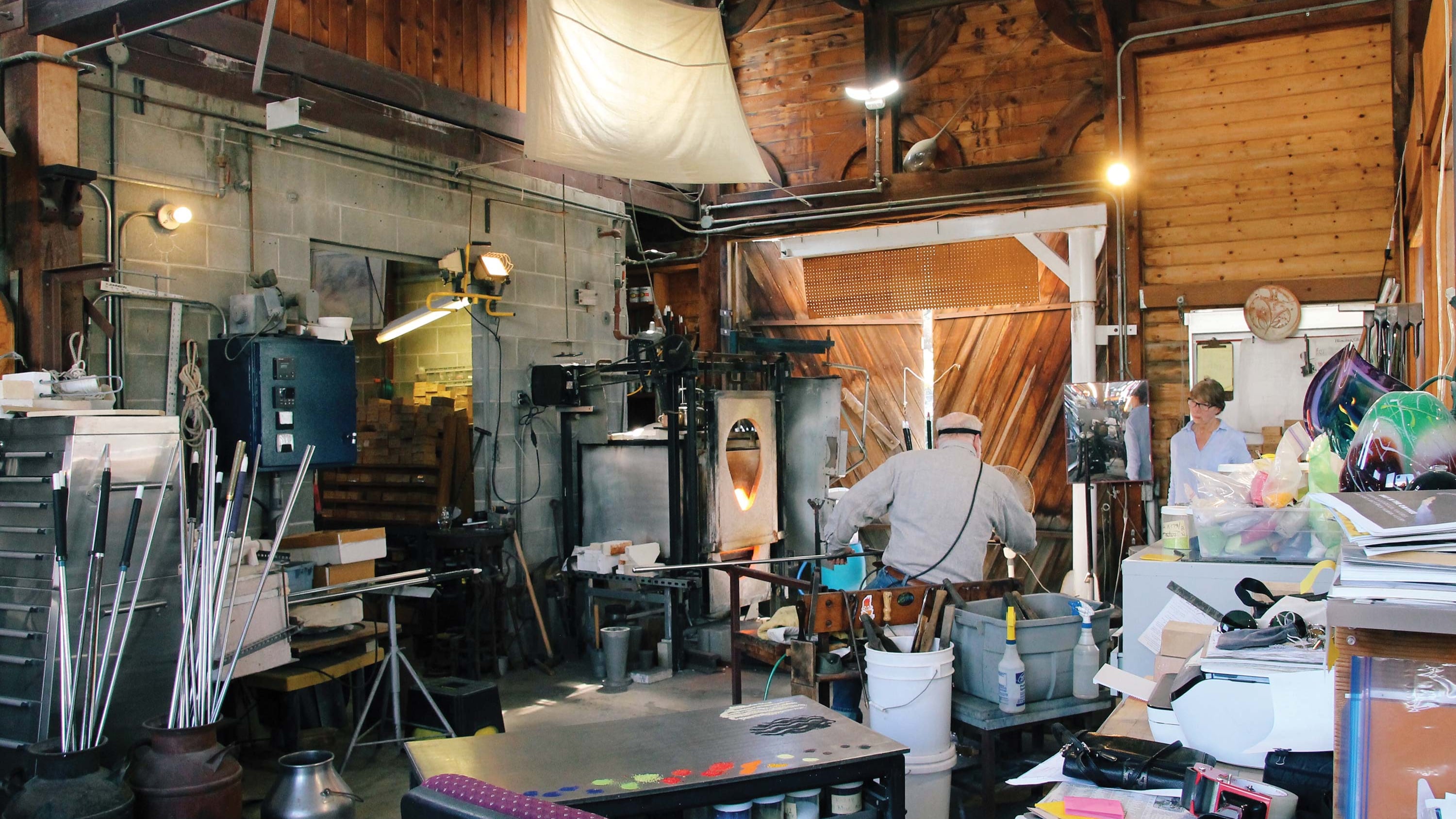 The rustic studio showcases intricate pieces made by well-renowned glass blowers.