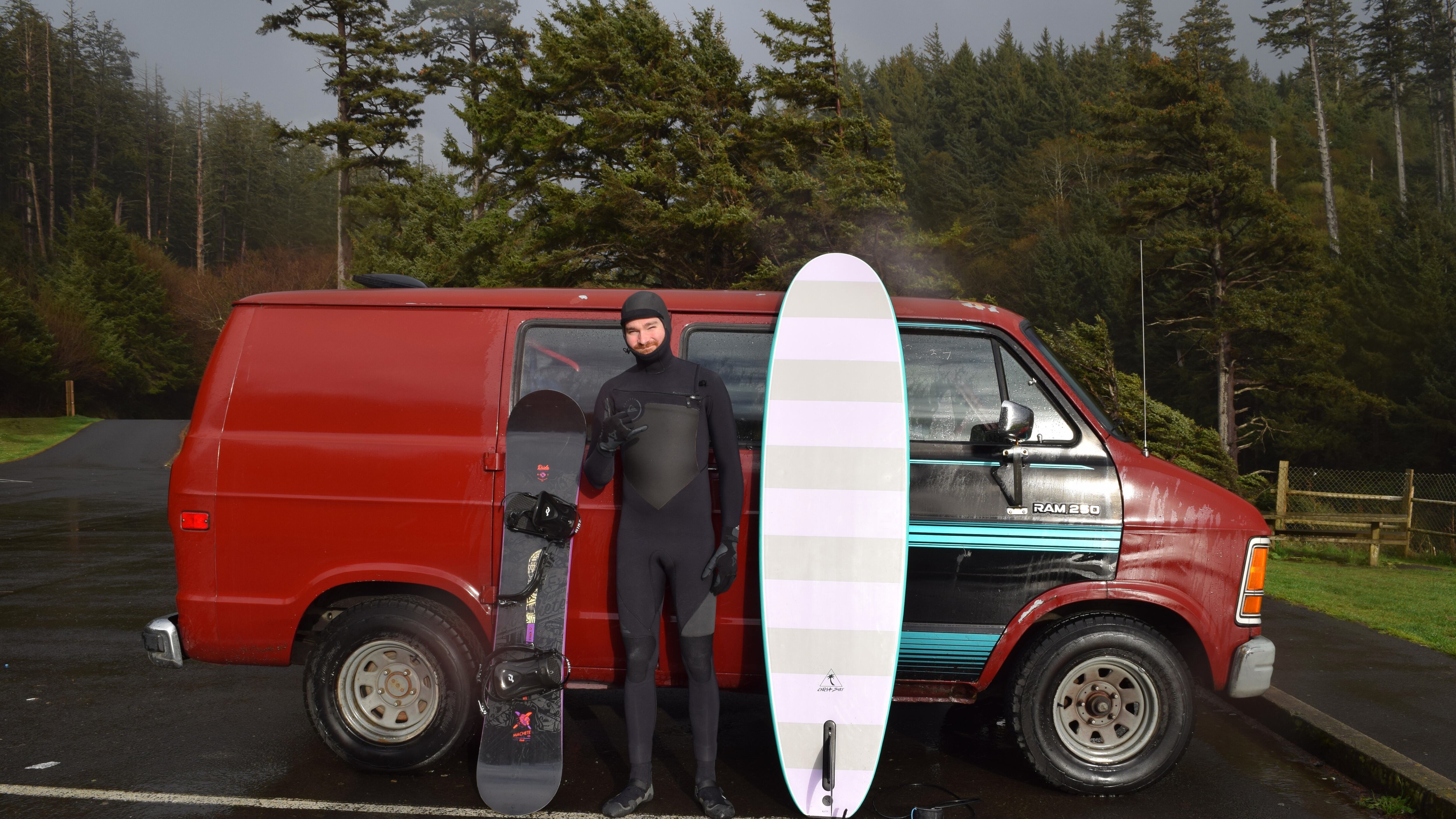 3:45 pm: I finally made it to Indian Beach. It was cold, overcast and windy, which was almost exactly what I expected. A few couples in sweats wandered around the parking lot, taking selfies with the craggy edge of the coast in the background and jumping back in their cars. A guy in a truck with Idaho plates stopped to ask, “What’s wrong with you?” as I wriggled into my suit. I told him about my grandiose dream to snowboard and surf on the same day, and he wished me luck with a sidelong glance. I expected him to drive off, but he sat there idling for a few more minutes. This was not the vibe I needed before diving face first into 50-degree salt water.