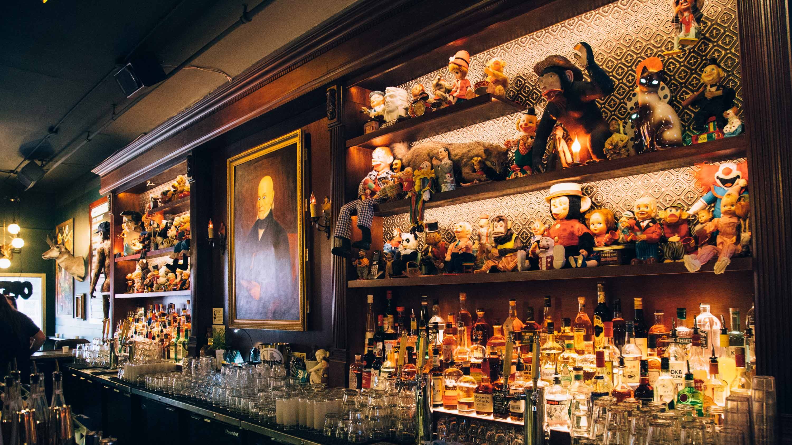 It doesn't take long within this strategically dim and unabashedly kooky bar to start having a good time. We'd describe it as a polished, nightmare carnival-themed parlor. The figures in paintings shift their gaze across the room, and among other bites, deep-fried peanuts serve as a bar snack. The classic cocktail lineup pack spins on old-fashioneds and highballs, but the real gem is a boozy coffee slushie ($7) topped with real coffee grounds.