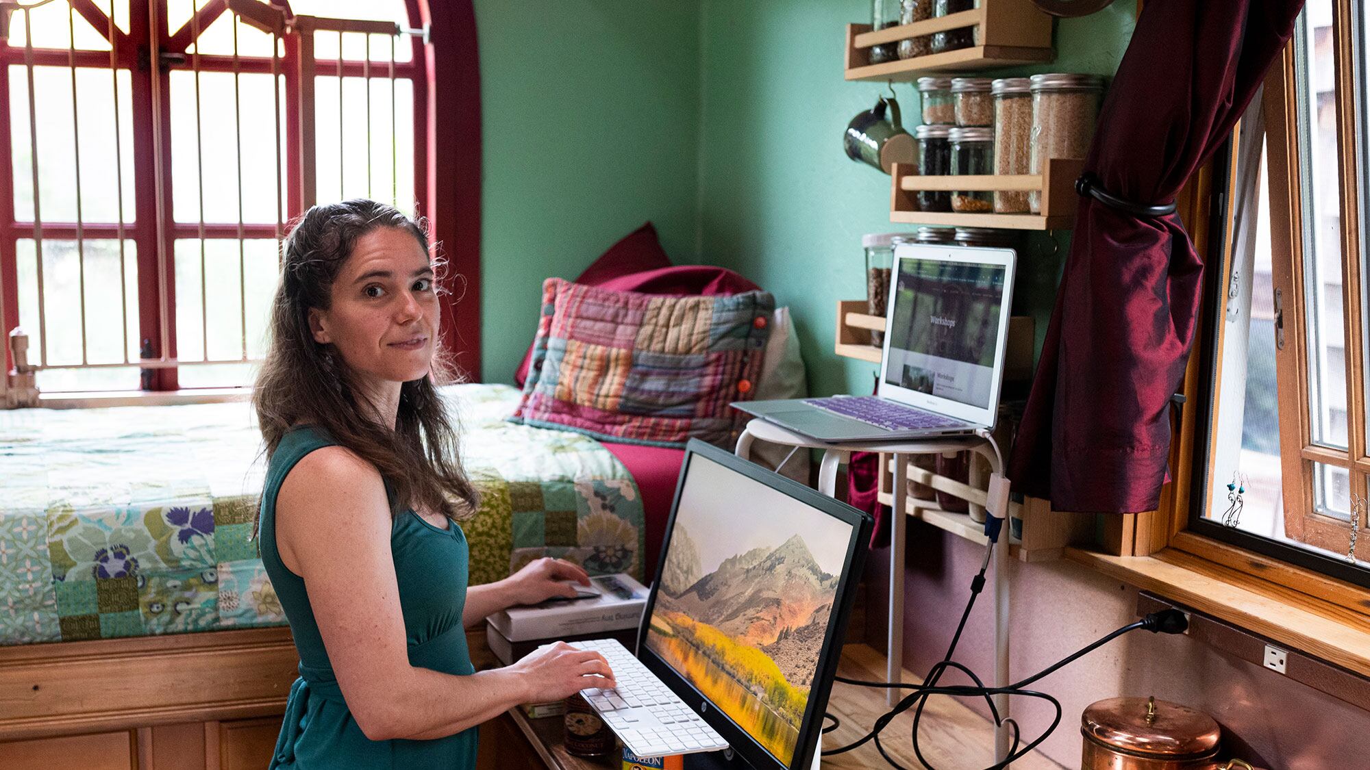 She's lived in tiny homes for nine years—she even designed her current one herself. Calling hers "tiny," though, might be an understatement. It's 100 square feet, making it "one of the tinier tiny houses out there," she says. Despite its size, visitors often refer to the house as a "cathedral" because of its large windows.