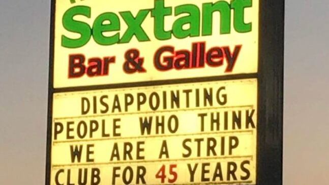 A few years ago, Kevin Welch, a bartender at The Sextant Bar & Galley, thought he’d have some fun with the sign out front. “Disappointing People Who Think We Are a Strip Club for 45 Years,” he wrote on the marquee, which beckons drivers along Northeast Marine Drive. It seems like an obvious joke, playing off the idea that, at a glance, the name of the bar appears to be “The Sex Tent.” According to Welch, though, it’s funny because it’s true. “That happens all the time,” he says. “A while back we had some gals come in wanting to know what they had to do to audition.” The sign earned the Sextant—which, in actuality, is named after a piece of nautical equipment—a nod to Tosh 2.0, and regulars still bring it up. But it wasn’t Welch’s first attempt at using humor to attract customers: He’s been the bar’s de facto copywriter for four years, switching out the messaging on the sign every few weeks, even while the bar was shut down due to the coronavirus. Here are a few examples of his handiwork.